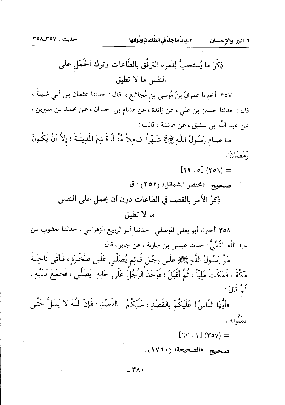 ذِكْرُ الْأَمْرِ بِالْقَصْدِ فِي الطَّاعَاتِ دُونَ أَنْ يَحْمِلَ عَلَى النَّفْسِ مَا لَا تُطِيقُ