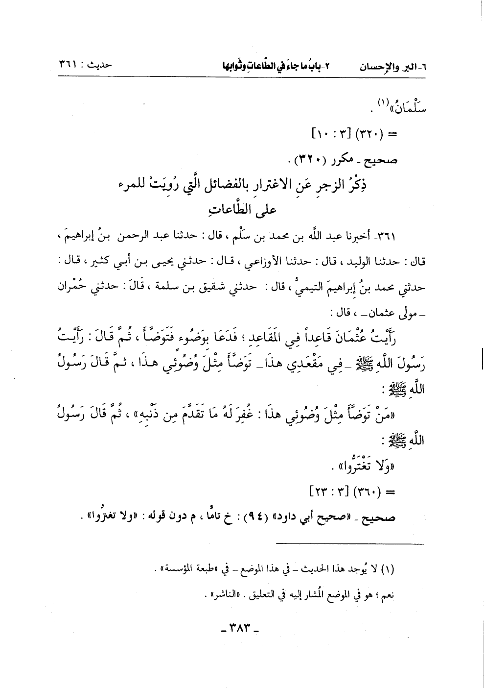 361 - أَخْبَرَنَا عَبْدُ اللَّهِ بْنُ مُحَمَّدِ بْنِ سَلْمٍ قَالَ: حَدَّثَنَا عَبْدُ الرَّحْمَنِ بْنُ إِبْرَاهِيمَ قَالَ: حَدَّثَنَا الْوَلِيدُ قَالَ: حَدَّثَنَا الْأَوْزَاعِيُّ قَالَ: حَدَّثَنِي يَحْيَى بْنُ أَبِي كَثِيرٍ قَالَ: حَدَّثَنِي مُحَمَّدُ بْنُ إِبْرَاهِيمَ التَّيْمِيُّ قَالَ: حَدَّثَنِي شَقِيقُ بْنُ سَلَمَةَ قَالَ: حَدَّثَنِي حُمْرَانُ مَوْلَى عُثْمَانَ قَالَ: