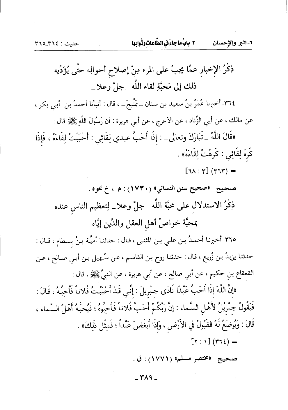 (قَالَ اللَّهُ تَبَارَكَ وَتَعَالَى: إِذَا أَحَبَّ عَبْدِي لِقَائِي أَحْبَبْتُ لِقَاءَهُ فَإِذَا كره لقائي كرهت لقاءه)
