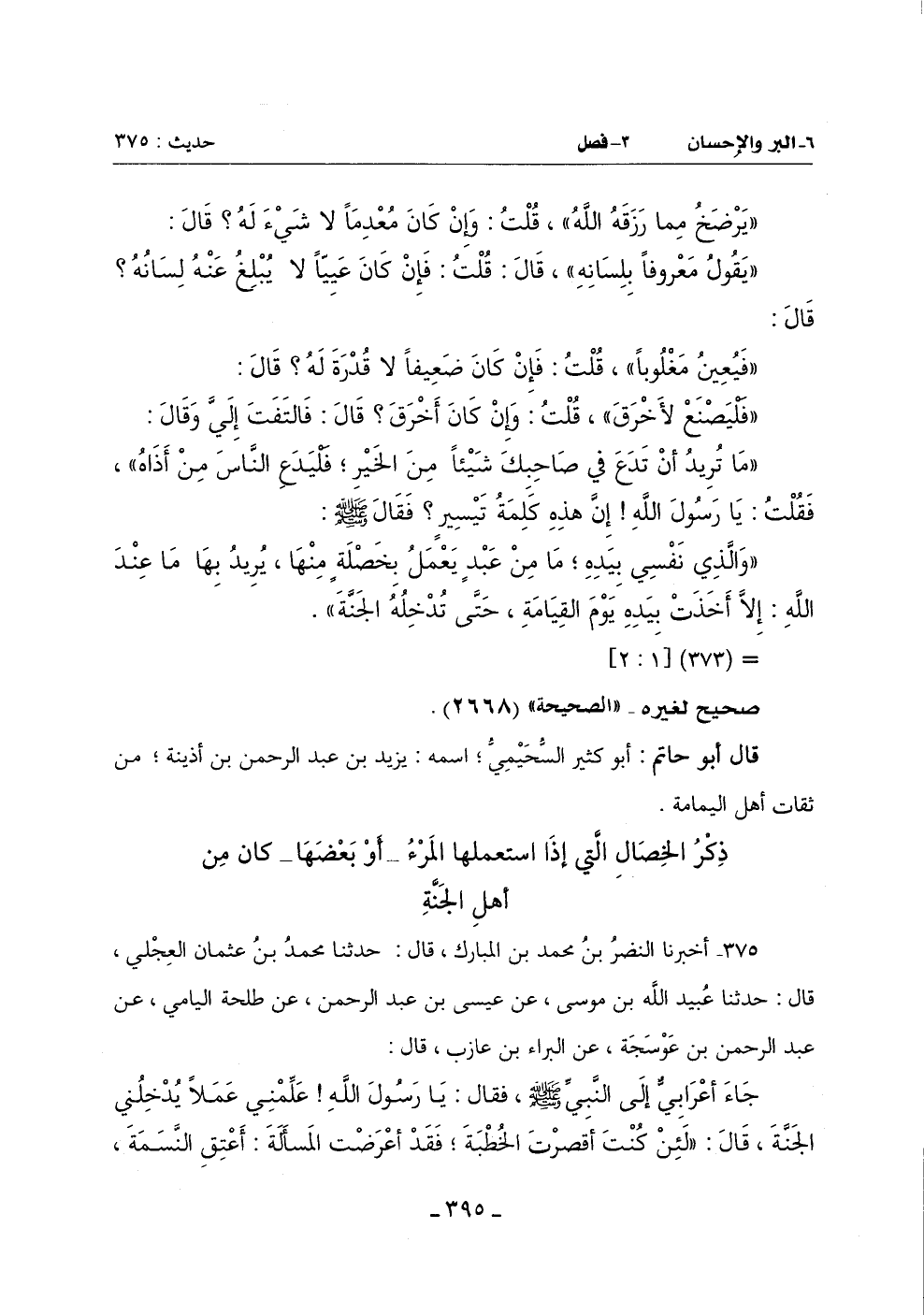 375 - أَخْبَرَنَا النَّضْرُ بْنُ مُحَمَّدِ بْنِ الْمُبَارَكِ قَالَ: حَدَّثَنَا مُحَمَّدُ بْنُ عُثْمَانَ الْعِجْلِيُّ قَالَ: حَدَّثَنَا عُبَيْدُ اللَّهِ بْنُ مُوسَى عَنْ عِيسَى بْنِ عَبْدِ الرَّحْمَنِ عَنْ طَلْحَةَ الْيَامِيِّ عَنْ عَبْدِ الرَّحْمَنِ بْنِ عَوْسَجَةَ عَنِ الْبَرَاءِ بْنِ عَازِبٍ قَالَ: