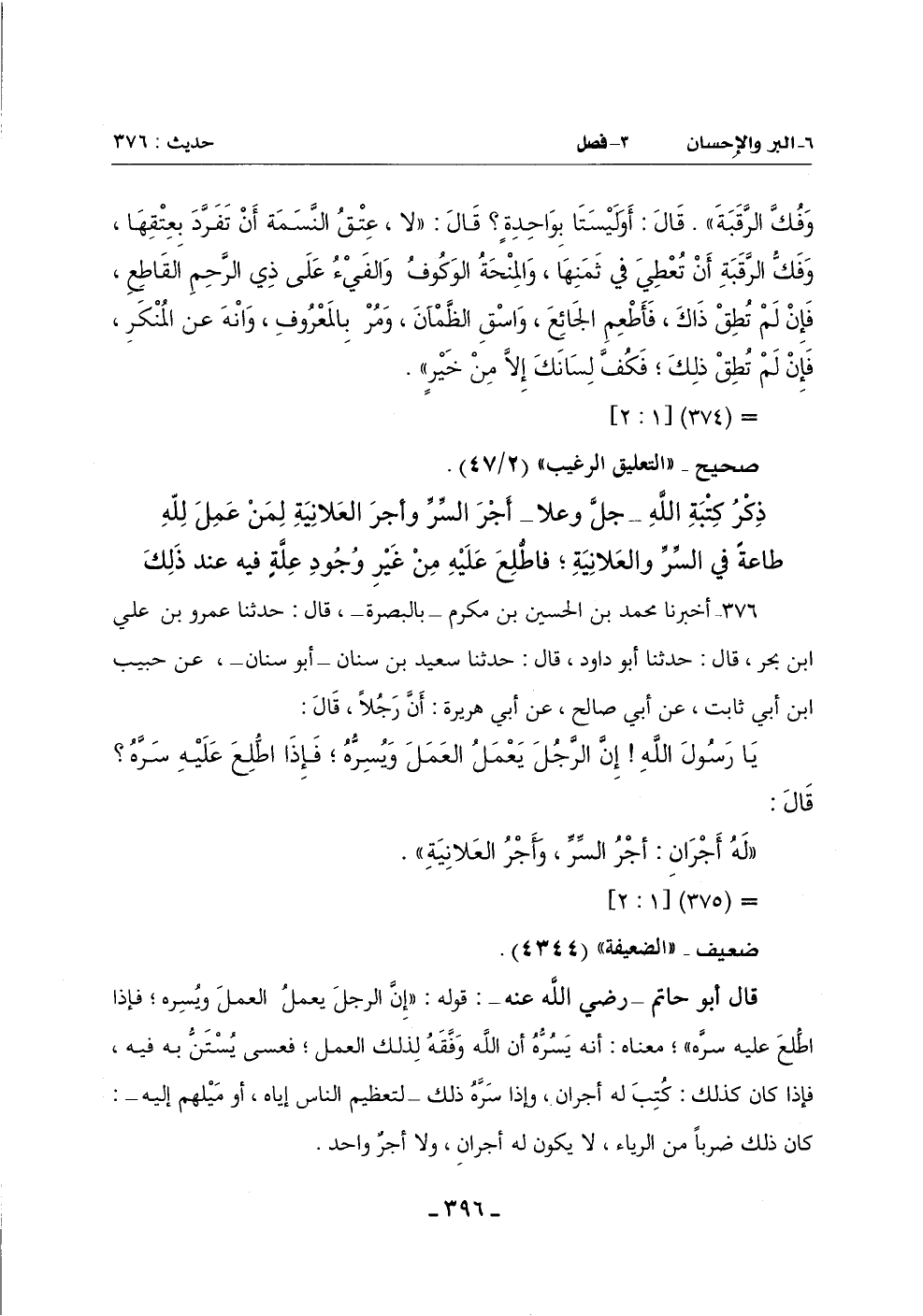 قَالَ أَبُو حَاتِمٍ رَضِيَ اللَّهُ عَنْهُ: قَوْلُهُ: (إِنَّ الرَّجُلَ يَعْمَلُ الْعَمَلَ وَيُسِرُّهُ فَإِذَا اطُّلِعَ عَلَيْهِ سَرَّهُ) مَعْنَاهُ أَنَّهُ يَسُرُّهُ أَنَّ اللَّهَ وَفَّقَهُ لِذَلِكَ الْعَمَلِ فَعَسَى يُسْتَنَّ بِهِ فِيهِ فَإِذَا كَانَ كَذَلِكَ كُتب لَهُ أَجْرَانِ وَإِذَا سَرَّهُ ذَلِكَ لِتَعْظِيمِ النَّاسِ إِيَّاهُ أَوْ مَيْلِهِمْ إِلَيْهِ كَانَ ذَلِكَ ضَرْبًا مِنَ الرِّيَاءِ لَا يَكُونُ لَهُ أَجْرَانِ وَلَا أَجْرٌ وَاحِدٌ