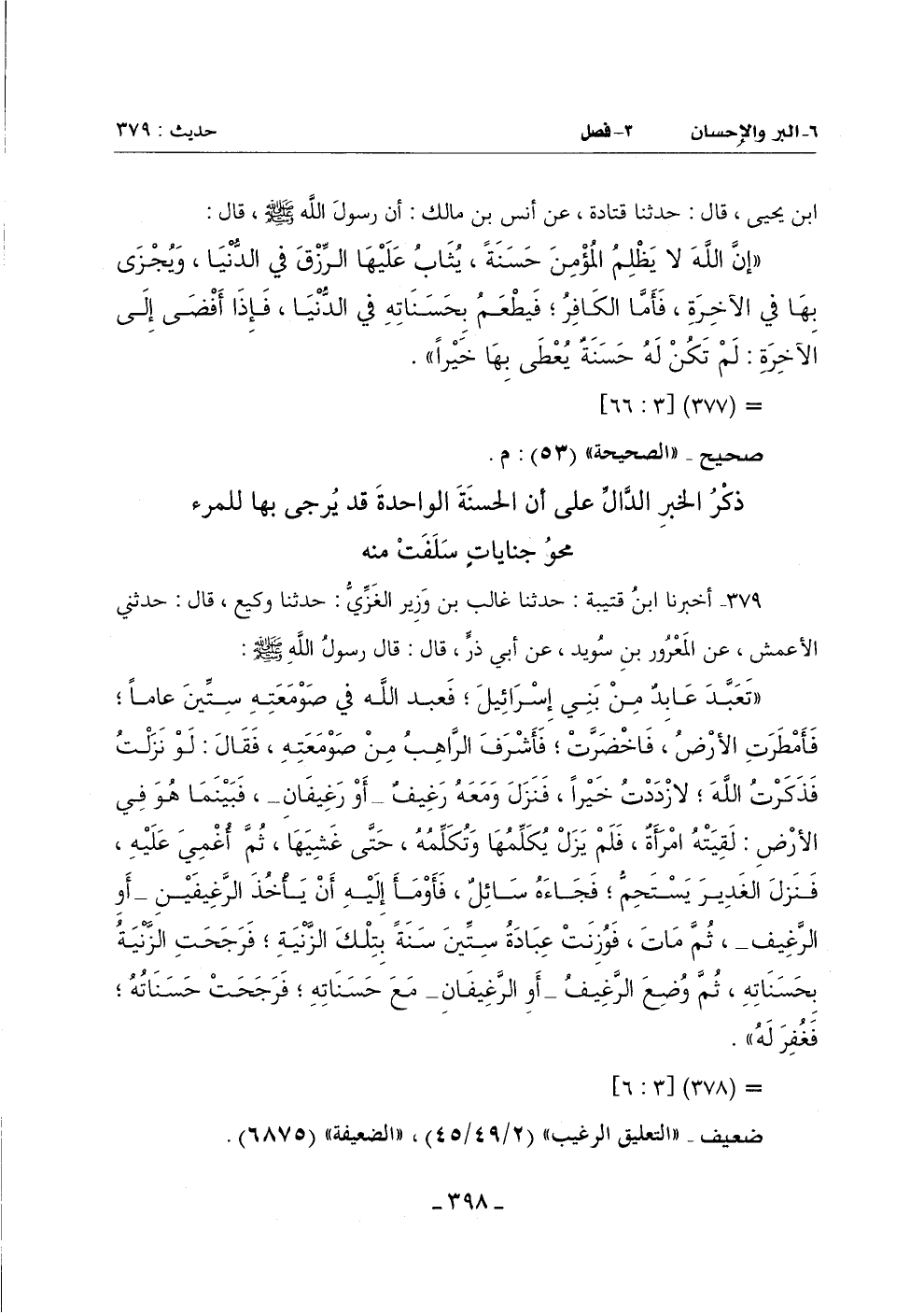 (تعبَّد عَابِدٌ مِنْ بَنِي إِسْرَائِيلَ فَعَبَدَ اللَّهَ فِي صَوْمَعَتِهِ سِتِّينَ عَامًا فَأَمْطَرَتِ الْأَرْضُ فَاخْضَرَّتْ فَأَشْرَفَ الرَّاهِبُ مِنْ صَوْمَعَتِهِ فقَالَ: لَوْ نزلتُ فَذَكَرْتُ اللَّهَ لَازْدَدْتُ خَيْرًا فَنَزَلَ وَمَعَهُ رَغِيفٌ أَوْ رَغِيفَانِ فَبَيْنَمَا هُوَ فِي الْأَرْضِ لَقِيَتْهُ امْرَأَةٌ فَلَمْ يَزَلْ يُكَلِّمُهَا وَتُكَلِّمُهُ حَتَّى غَشِيَهَا ثُمَّ أُغمي عَلَيْهِ فَنَزَلَ الْغَدِيرَ يَسْتَحِمُّ فَجَاءَهُ سَائِلٌ فَأَوْمَأَ إِلَيْهِ أَنْ يَأْخُذَ الرَّغِيفَيْنِ أَوِ الرَّغِيفَ ثُمَّ مَاتَ فَوُزِنَتْ عِبَادَةُ سِتِّينَ سَنَةً بِتِلْكَ الزَّنْيَةِ فَرَجَحَتِ الزَّنْيَةُ بِحَسَنَاتِهِ ثُمَّ وُضع الرَّغِيفُ أَوِ الرَّغِيفَانِ مَعَ حَسَنَاتِهِ فَرَجَحَتْ حَسَنَاتُهُ فغُفر له)