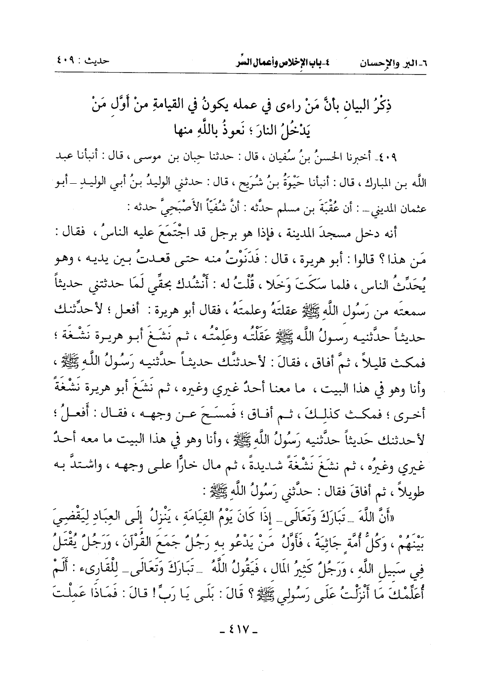 (أَنَّ اللَّهَ تَبَارَكَ وَتَعَالَى إِذَا كَانَ يَوْمُ الْقِيَامَةِ يَنْزِلُ إِلَى الْعِبَادِ لِيَقْضِيَ بَيْنَهُمْ وَكُلُّ أُمَّةٍ جاثيةٌ فَأَوَّلُ مَنْ يَدْعُو بِهِ رَجُلٌ جَمَعَ الْقُرْآنَ وَرَجُلٌ يُقتل فِي سَبِيلِ اللَّهِ وَرَجُلٌ كَثِيرُ الْمَالِ فَيَقُولُ اللَّهُ تبارك وتعالى للقارىء: أَلَمْ أُعَلِّمْكَ مَا أَنْزَلْتُ عَلَى رَسُولِي صَلَّى اللَّهُ عَلَيْهِ وَسَلَّمَ؟ قَالَ: بَلَى يَا رَبِّ قَالَ: فَمَاذَا عَمِلْتَ فِيمَا عَلِمْتَ؟ قَالَ: كُنْتُ أَقُومُ بِهِ آنَاءَ اللَّيْلِ وَآنَاءَ النَّهَارِ فَيَقُولُ اللَّهُ تَبَارَكَ وَتَعَالَى لَهُ: كذبتَ وَتَقُولُ لَهُ الْمَلَائِكَةُ: كذبتَ وَيَقُولُ اللَّهُ: بَلْ أَرَدْتَ أَنْ يقال: فلان قارىء فَقَدْ قِيلَ ذَاكَ