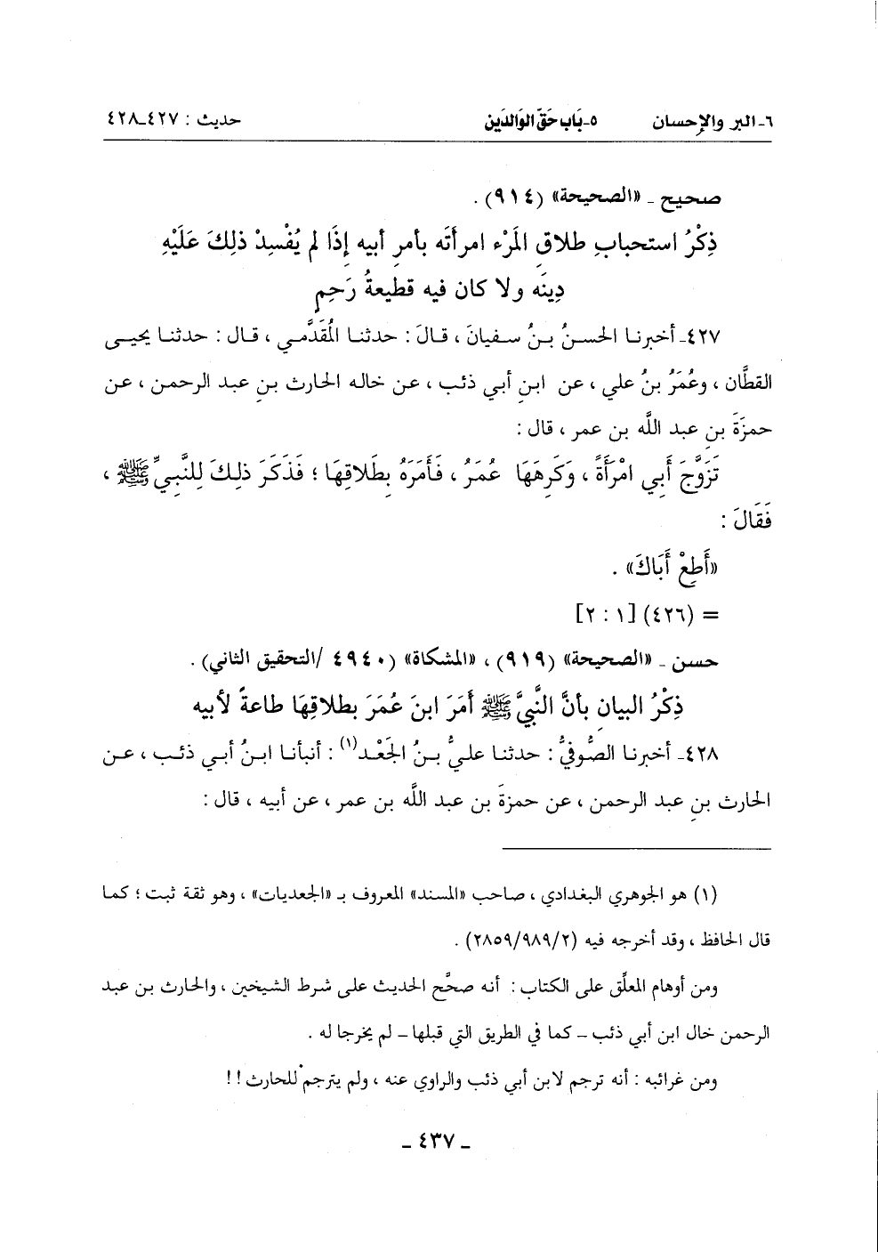 428 - أَخْبَرَنَا الصُّوفِيُّ حَدَّثَنَا عَلِيُّ بْنُ الْجَعْدِ (¬1) أَنْبَأَنَا ابْنُ أَبِي ذِئْبٍ عَنِ الْحَارِثِ بْنِ عَبْدِ الرَّحْمَنِ عَنْ حَمْزَةَ بْنِ عَبْدِ اللَّهِ بْنِ عُمَرَ: عَنْ أَبِيهِ قَالَ: -[438]-