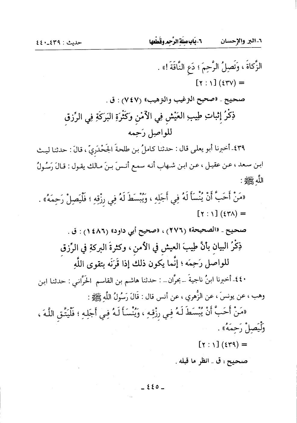 440 - أَخْبَرَنَا ابْنُ نَاجِيَةَ بِحَرَّانَ حَدَّثَنَا هَاشِمُ بْنُ الْقَاسِمِ الْحَرَّانِيُّ حَدَّثَنَا ابْنُ وَهْبٍ عَنْ يُونُسَ عَنِ الزُّهْرِيِّ: عَنْ أَنَسٍ قَالَ: قَالَ رَسُولُ اللَّهِ صَلَّى اللَّهُ عَلَيْهِ وَسَلَّمَ: