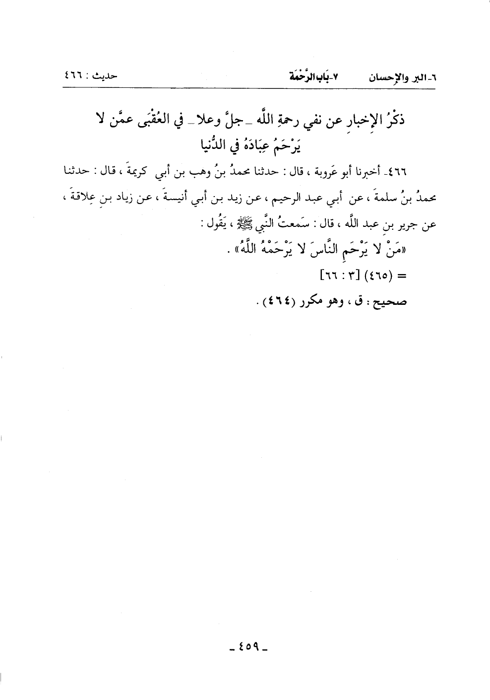 466 - أَخْبَرَنَا أَبُو عَرُوبَةَ قَالَ: حَدَّثَنَا مُحَمَّدُ بْنُ وَهْبِ بْنِ أَبِي كَرِيمَةَ قَالَ: حَدَّثَنَا مُحَمَّدُ بْنُ سَلَمَةَ عَنْ أَبِي عَبْدِ الرَّحِيمِ عَنْ زَيْدِ بْنِ أَبِي أُنَيْسَةَ عَنْ زِيَادِ بْنِ عِلَاقَةَ: عَنْ جَرِيرِ بْنِ عَبْدِ اللَّهِ قَالَ: سَمِعْتُ النَّبِيَّ صَلَّى اللَّهُ عَلَيْهِ وَسَلَّمَ يَقُولُ: