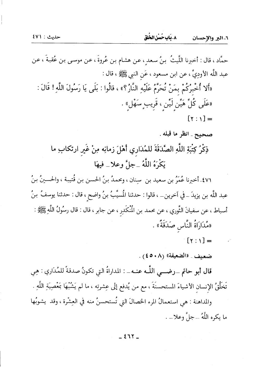 قَالَ أَبُو حَاتِمٍ رَضِيَ اللَّهُ عَنْهُ: الْمُدَارَاةُ الَّتِي تَكُونُ صَدَقَةً لِلْمُدَارِي هِيَ تَخَلُّقُ الْإِنْسَانِ الْأَشْيَاءَ الْمُسْتَحْسَنَةَ مَعَ مَنْ يُدفع إِلَى عِشْرَتِهِ مَا لَمْ يَشُبْهَا بِمَعْصِيَةِ اللَّهِ.