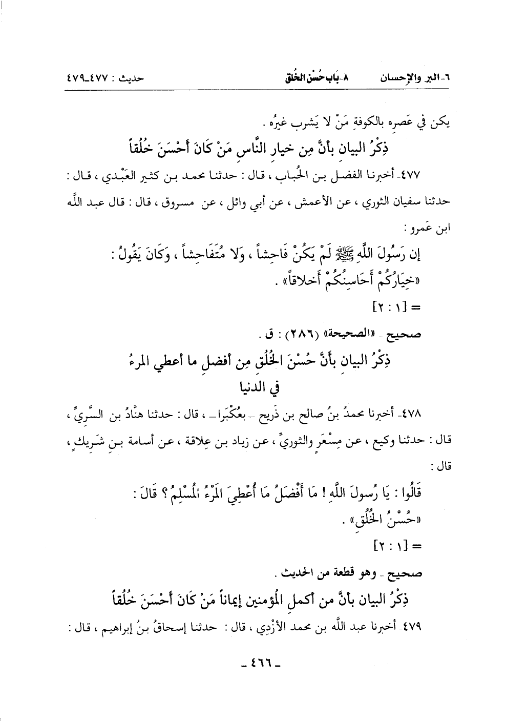 477 - أَخْبَرَنَا الْفَضْلُ بْنُ الْحُبَابِ قَالَ: حَدَّثَنَا مُحَمَّدُ بْنُ كَثِيرٍ الْعَبْدِيُّ قَالَ: حَدَّثَنَا سُفْيَانُ الثَّوْرِيُّ عَنِ الْأَعْمَشِ عَنْ أَبِي وَائِلٍ عَنْ مَسْرُوقٍ قَالَ: قَالَ عَبْدُ اللَّهِ بْنُ عَمْرٍو: