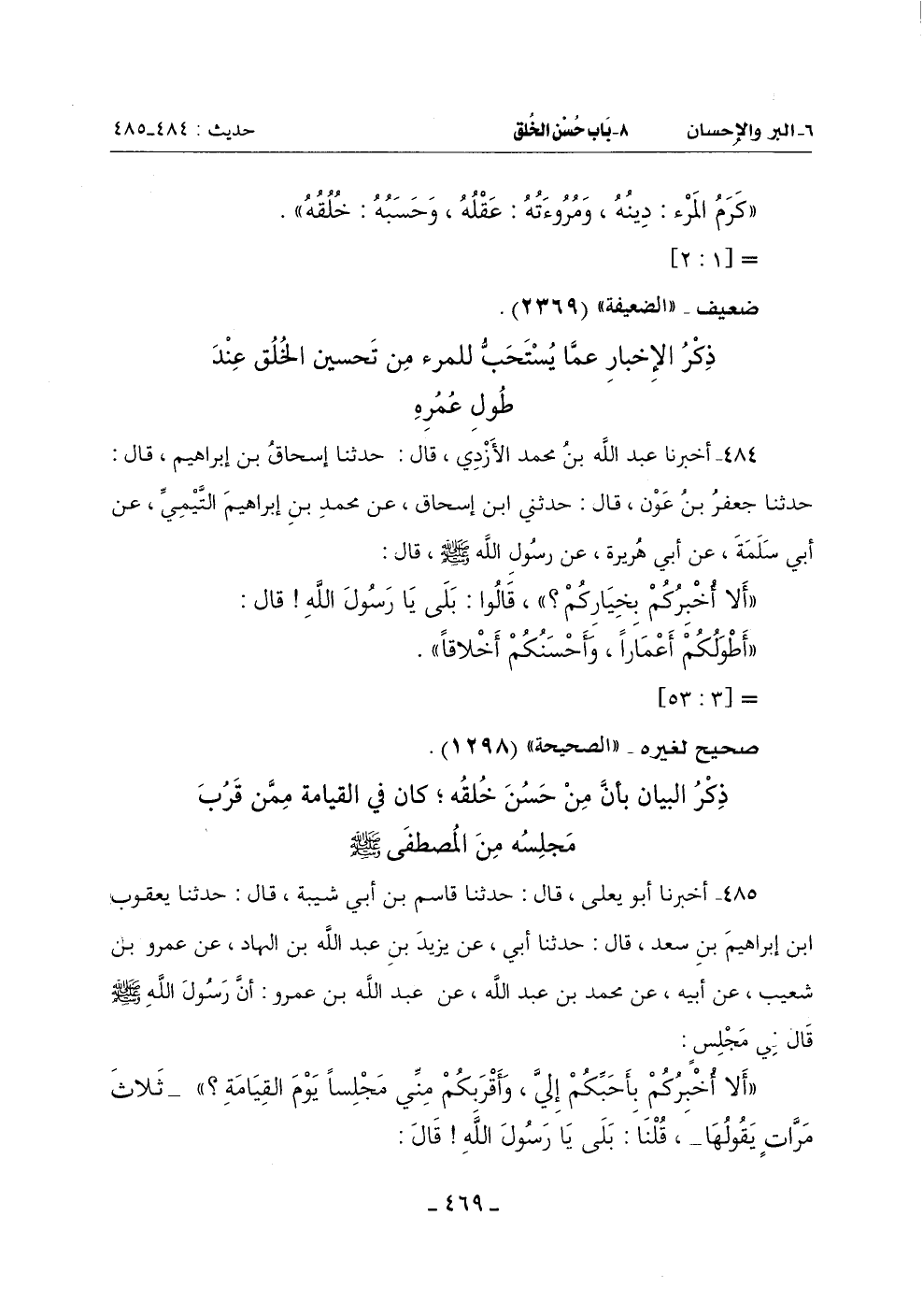 (أَلَا أُخْبِرُكُمْ بِأَحَبِّكُمْ إِلَيَّ وَأَقْرَبِكُمْ مِنِّي مجلساًَ يَوْمَ الْقِيَامَةِ؟ ) - ثَلَاثَ مَرَّاتٍ يَقُولُهَا - قُلْنَا: بَلَى يَا رَسُولَ اللَّهِ قَالَ: -[470]-