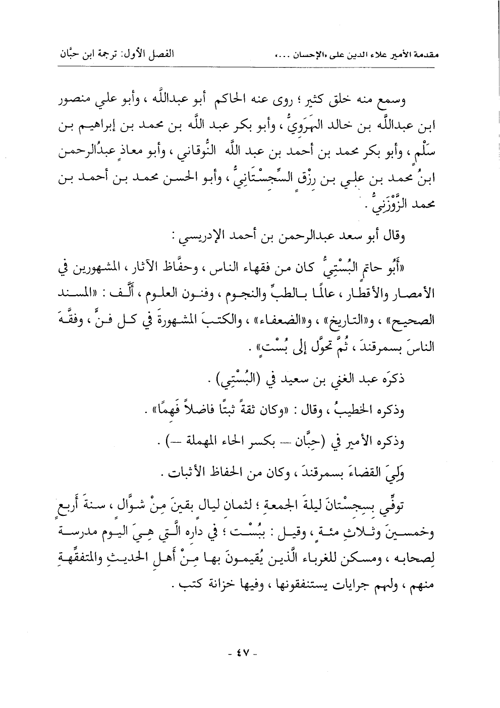 أبو حاتم البُسْتِيُّ كان من فقهاء الناس وحفَّاظ الآثار المشهورين في الأمصار والأقطار عالماً بالطب والنجوم وفنون العلوم ألَّف: ((المسند الصحيح)) , و ((التاريخ)) , و ((الضعفاء)) , والكتب المشهورة في كل فنٍّ وفقَّهَ الناس بسمرقند ثم تحوَّل إلى بُسْتٍ.