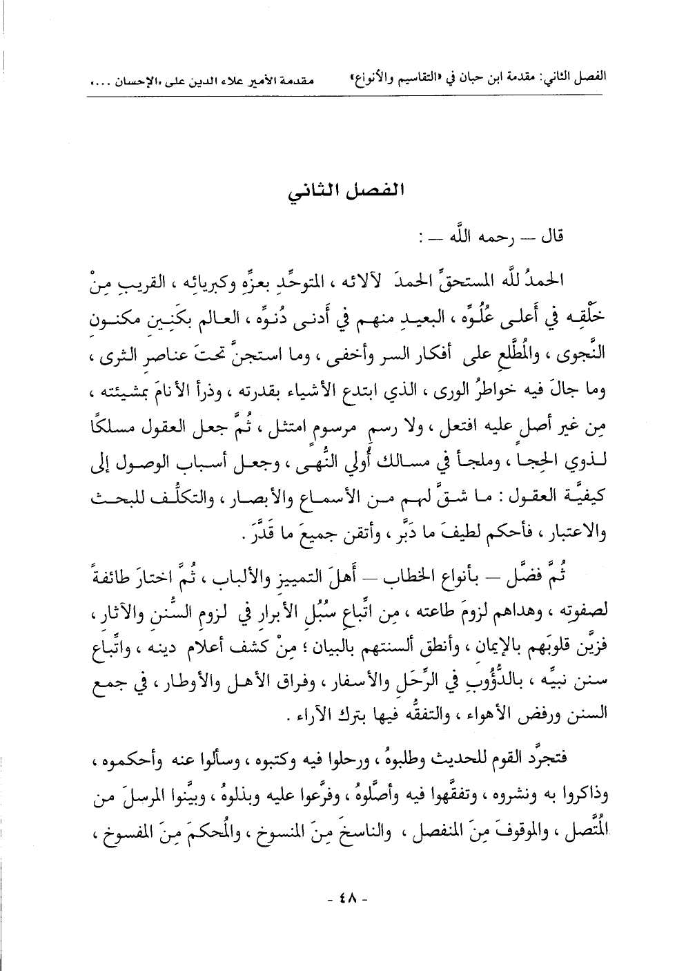 ثم فضَّل ـ بأنواع الخطاب ـ أهل التمييز والألباب ثم اختار طائفة لصفوته وهداهم لزوم طاعته من اتباع سُبُلِ الأبرار في لزوم السنن والآثار فزيَّن قلوبهم بالإيمان وأنطق ألسنتهم بالبيان من كشف أعلام دينه واتباع سنن نبيه بالدُّؤُوب في الرَّحَل والأسفار وفراق الأهل والأوطار في جمع السنن ورفض الأهواء والتفقُّه بترك الآراء.