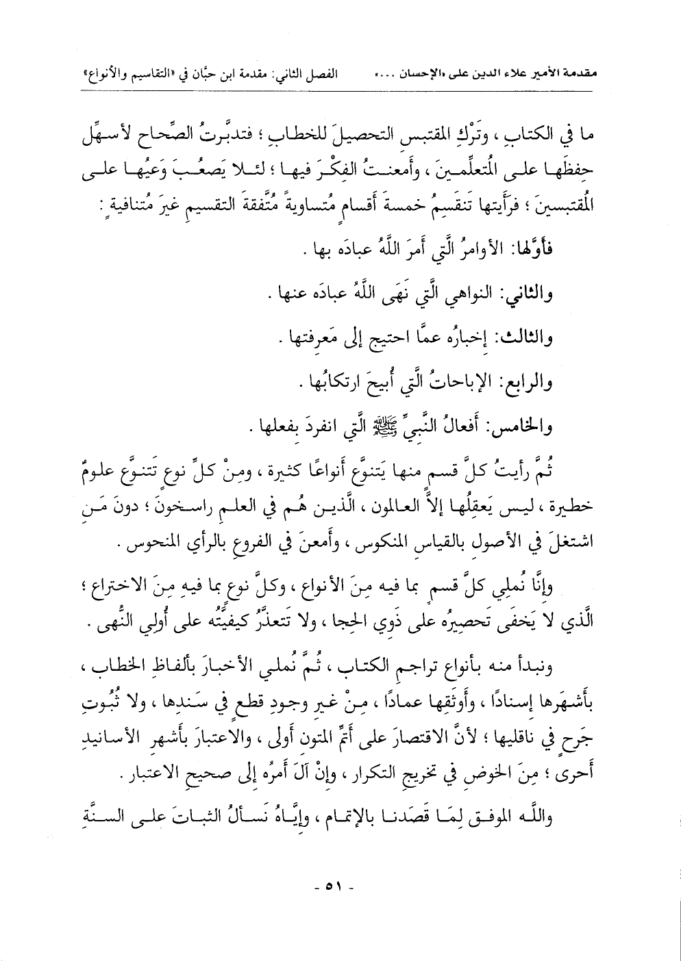 ما في الكتاب وتَرْكِ المقتبس التحصيل للخطاب فتدبَّرتُ الصِّحاح لأسهِّل حفظها على المتعلِّمين وأمعنت الفكر فيها لئلا يصعُب وَعيُها على المقتبسين فرأيتها تنقسم خمسة أقسام متساوية مُتَّفقة التقسيم غير مُتنافيةٍ: