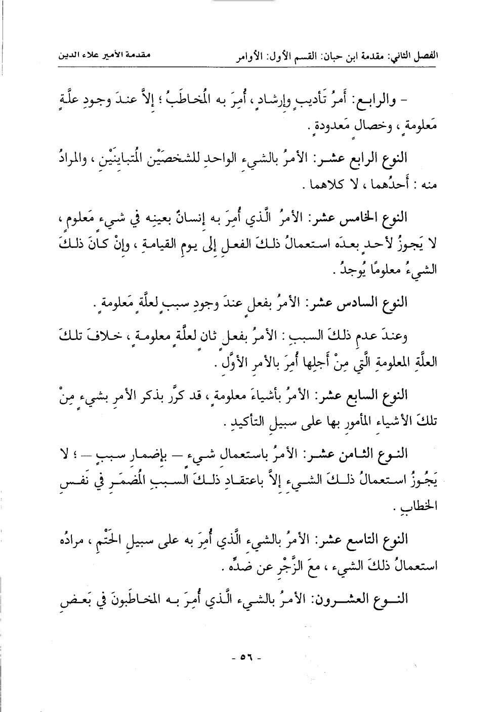 ـ والرابع: أمر تأديب وإرشاد أُمِرَ به المخاطب إلا عند وجود علَّةٍ معلومة وخصال معدودة. النوع الرابع عشر: الأمر بالشيء الواحد للشخصين المتباينين والمراد منه: أحدهما لا كلاهما.