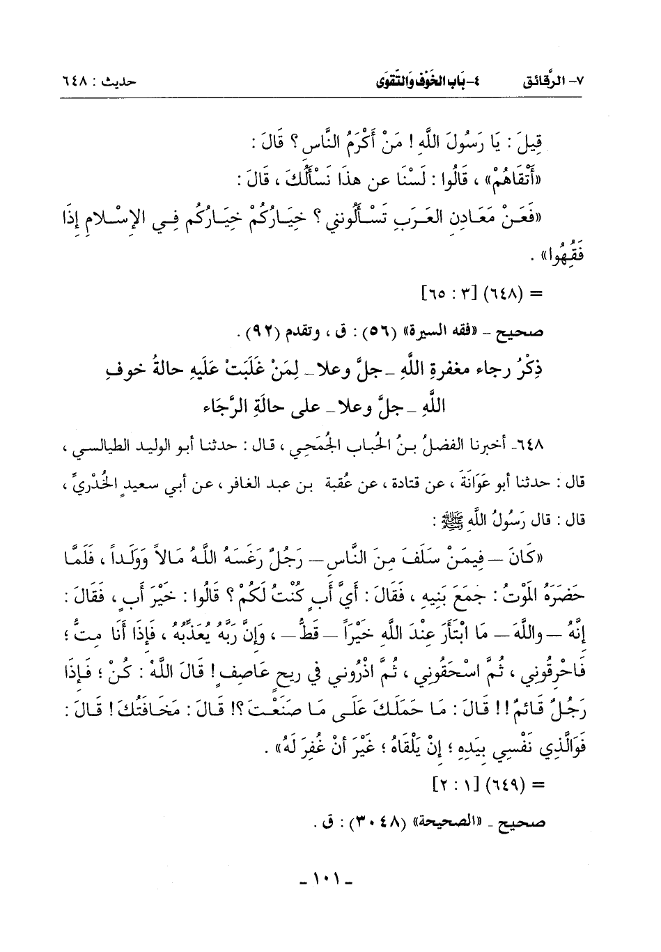 (كَانَ فِيمَنْ سَلَفَ مِنَ النَّاسِ رَجُلٌ رَغَسَهُ اللَّهُ مَالًا وَوَلَدًا فَلَمَّا حَضَرَهُ الْمَوْتُ جَمَعَ بَنِيهِ فقَالَ: أَيَّ أَبٍ كُنْتُ لَكُمْ؟ قَالُوا: خَيْرَ أبٍ فقَالَ: إِنَّهُ وَاللَّهِ مَا ابْتَأَرَ عِنْدَ اللَّهِ خَيْرًا قَطُّ وَإِنَّ رَبَّهُ يعذِّبه فَإِذَا أَنَا مِتُّ فَأَحْرِقُونِي ثُمَّ اسْحَقُونِي ثُمَّ اذْرُونِي فِي رِيحٍ عَاصِفٍ قَالَ اللَّهُ: كُنْ فَإِذَا رَجُلٌ قَائِمٌ قَالَ: مَا حَمَلَكَ عَلَى مَا صَنَعْتَ؟ قَالَ: مَخَافَتُكَ! قَالَ: فَوَالَّذِي نَفْسِي بِيَدِهِ إِنْ يلقاه غير أن غُفِرَ له)