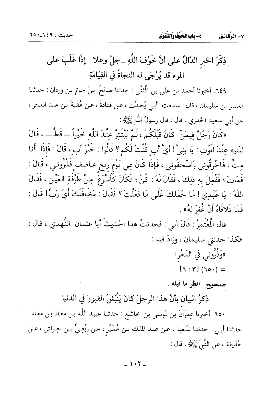 (كَانَ رَجُلٌ فِيمَنْ كَانَ قَبْلَكُمْ لَمْ يَبْتَئِرْ عِنْدَ اللَّهِ خَيْرًا قَطُّ قَالَ لِبَنِيهِ عِنْدَ الْمَوْتِ: يَا بَنِيَّ أيَّ أبٍ كُنْتُ لَكُمْ؟ قَالُوا: خَيْرَ أَبٍ قَالَ: فَإِذَا أَنَا مِتُّ فَاحْرَقُونِي واسْحَقُونِي فَإِذَا كَانَ فِي يَوْمِ رِيحٍ عَاصِفٍ فَذُرُّونِي قَالَ: فَمَاتَ ففُعل بِهِ ذَلِكَ فقَالَ لَهُ: كُنْ فَكَانَ كَأَسْرَعِ مِنْ طَرْفَةِ الْعَيْنِ فقَالَ اللَّهُ: يَا عَبْدِي مَا حَمَلَكَ عَلَى مَا فَعَلْتَ؟ فقَالَ: مَخَافَتُكَ أَيْ رَبِّ قَالَ: فَمَا تَلافَاهُ أَنْ غُفِرَ لَهُ)