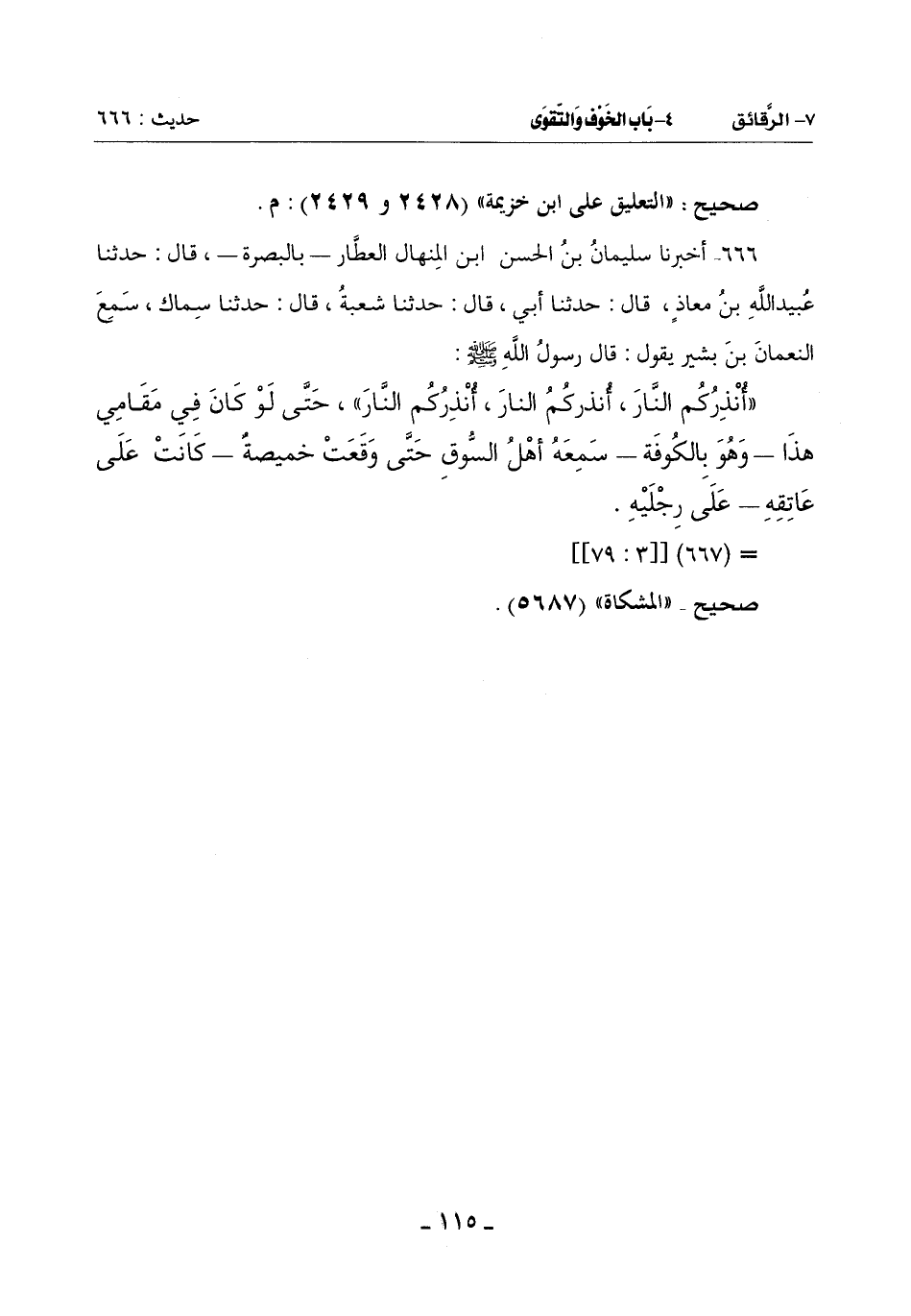 666 - أَخْبَرَنَا سُلَيْمَانُ بْنُ الْحَسَنِ بْنِ الْمِنْهَالِ الْعَطَّارُ بِالْبَصْرَةِ قَالَ: حَدَّثَنَا عُبَيْدُ اللَّهِ بْنُ مُعَاذٍ قَالَ: حَدَّثَنَا أَبِي قَالَ: حَدَّثَنَا شُعْبَةُ قَالَ: حَدَّثَنَا سِمَاكٌ سَمِعَ النُّعْمَانَ بْنَ بَشِيرٍ يَقُولُ: قَالَ رَسُولُ اللَّهِ صَلَّى اللَّهُ عَلَيْهِ وَسَلَّمَ: