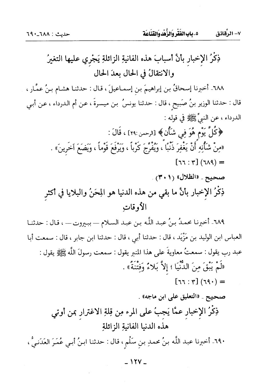 688 - أَخْبَرَنَا إِسْحَاقُ بْنُ إِبْرَاهِيمَ بْنِ إِسْمَاعِيلَ قَالَ: حَدَّثَنَا هِشَامُ بْنُ عَمَّارٍ قَالَ: حَدَّثَنَا الْوَزِيرُ بْنُ صُبَيْحٍ قَالَ: حَدَّثَنَا يُونُسُ بْنُ مَيْسَرَةَ عَنْ أُمِّ الدَّرْدَاءِ عَنْ أَبِي الدَّرْدَاءِ عَنِ النَّبِيِّ صَلَّى اللَّهُ عَلَيْهِ وَسَلَّمَ فِي قَوْلِهِ:
