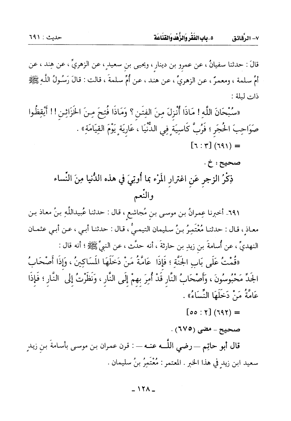 قَالَ أَبُو حَاتِمٍ ـ رَضِيَ اللَّهُ عَنْهُ ـ: قَرَنَ عِمْرَانُ بْنُ مُوسَى بِأُسَامَةَ بْنِ زَيْدٍ سَعِيدَ بْنَ زَيْدٍ فِي هَذَا الْخَبَرِ الْمُعْتَمِرُ: مُعْتَمِرُ بن سليمان