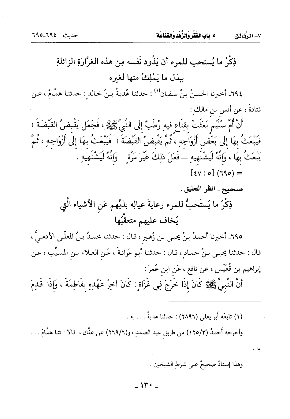 694 - أَخْبَرَنَا الْحَسَنُ بْنُ سُفْيَانَ (¬1): حَدَّثَنَا هُدْبَةُ بْنُ خَالِدٍ حَدَّثَنَا هَمَّامٌ عَنْ قَتَادَةَ عَنْ أَنَسِ بْنِ مَالِكٍ