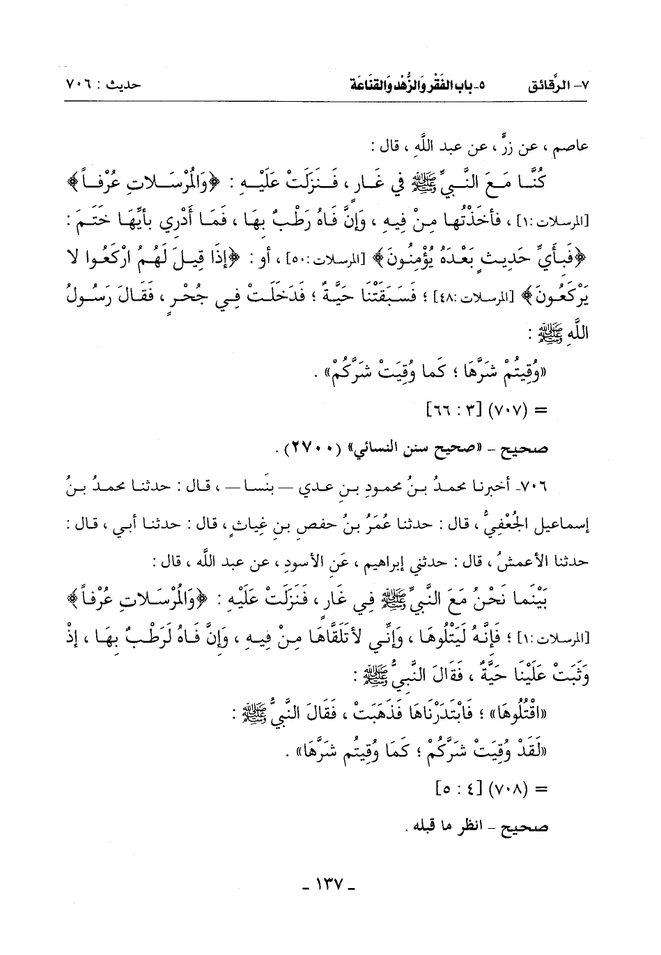 بَيْنَمَا نَحْنُ مَعَ النَّبِيِّ صَلَّى اللَّهُ عَلَيْهِ وَسَلَّمَ فِي غَارٍ فَنَزَلَتْ عَلَيْهِ: {وَالْمُرْسَلَاتِ عُرْفًا} [المرسلات: 1] فَإِنَّهُ لَيَتْلُوهَا وَإِنِّي لَأَتَلَقَّاهَا مِنْ فِيهِ وَإِنَّ فَاهُ لَرَطْبٌ بِهَا إِذْ وَثَبَتْ عَلَيْنَا حَيَّةٌ فقَالَ النَّبِيُّ صَلَّى اللَّهُ عَلَيْهِ وَسَلَّمَ: