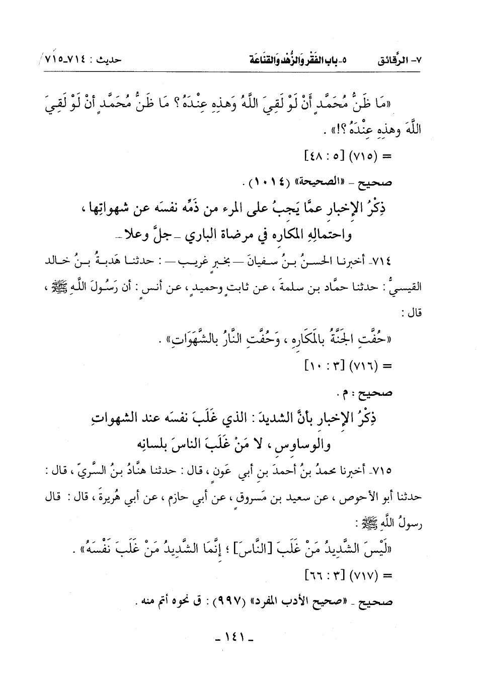 715 - أَخْبَرَنَا مُحَمَّدُ بْنُ أَحْمَدَ بْنِ أَبِي عَوْنٍ قَالَ: حَدَّثَنَا هَنَّادُ بْنُ السَّرِيِّ قَالَ: حَدَّثَنَا أَبُو الْأَحْوَصِ عَنْ سَعِيدِ بْنِ مَسْرُوقٍ عَنْ أَبِي حَازِمٍ عَنْ أَبِي هُرَيْرَةَ قَالَ: قَالَ رَسُولُ اللَّهِ صَلَّى اللَّهُ عَلَيْهِ وَسَلَّمَ: