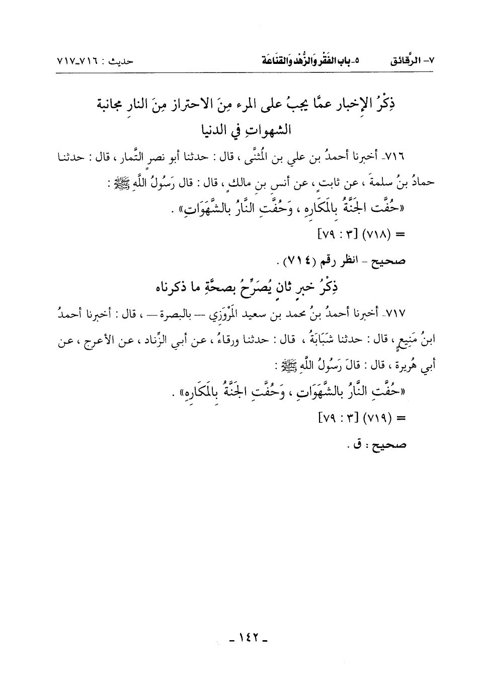 716 - أَخْبَرَنَا أَحْمَدُ بْنُ عَلِيِّ بْنِ الْمُثَنَّى قَالَ: حَدَّثَنَا أَبُو نَصْرٍ التَّمَّارُ قَالَ: حَدَّثَنَا حَمَّادُ بْنُ سَلَمَةَ عَنْ ثَابِتٍ عَنْ أَنَسِ بْنِ مَالِكٍ قَالَ: قَالَ رَسُولُ اللَّهِ صَلَّى اللَّهُ عَلَيْهِ وَسَلَّمَ: