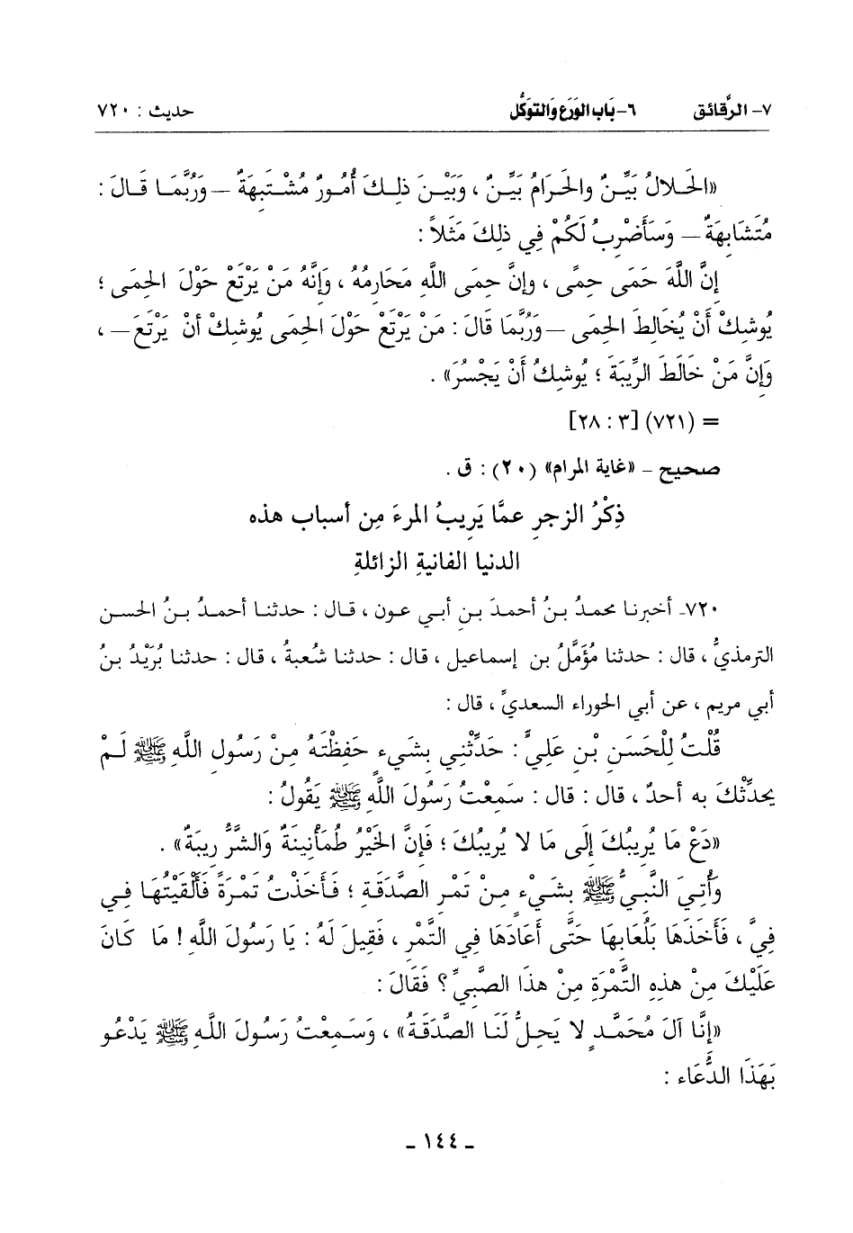 (إنَّا آلَ مُحَمَّدٍ لَا يَحِلُّ لَنَا الصَّدَقَةُ) وَسَمِعْتُ رَسُولَ اللَّهِ صَلَّى اللَّهُ عَلَيْهِ وَسَلَّمَ يَدْعُو بِهَذَا الدُّعَاءِ: -[145]-