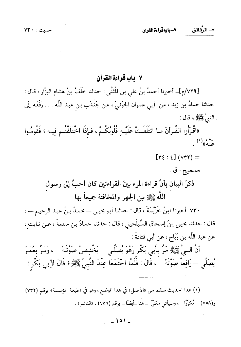 (¬1) هذا الحديث سقط من ((الأصل)) في هذا الموضع، وهو في ((طبعة المؤسسة)) برقم (732) و (758) _مكرراً _، وسيأتي مكرراً _ هنا _ أيضاً _ برقم (756). ((الناشر)).