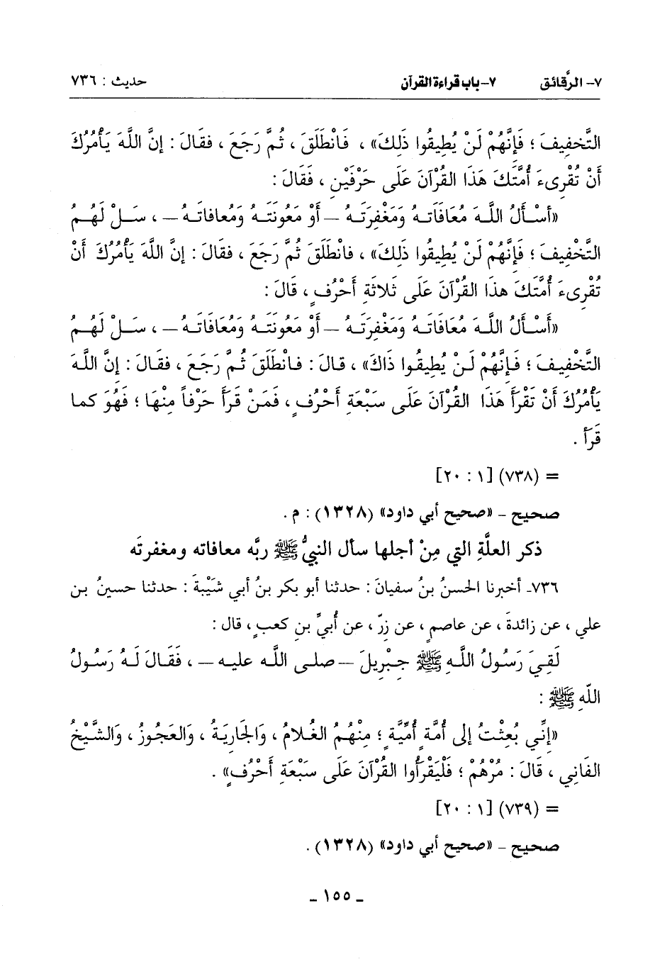 736 - أَخْبَرَنَا الْحَسَنُ بْنُ سُفْيَانَ حَدَّثَنَا أَبُو بَكْرِ بْنُ أَبِي شَيْبَةَ حَدَّثَنَا حُسَيْنُ بْنُ عَلِيٍّ عَنْ زَائِدَةَ عَنْ عَاصِمٍ عَنْ زِرٍّ عَنْ أُبَيِّ بْنِ كَعْبٍ قَالَ: