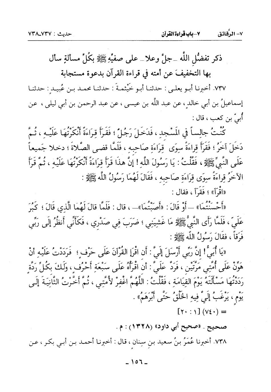 (يَا أُبَيُّ إِنَّ رَبِّي أَرْسَلَ إِلَيَّ: أَنِ اقْرَأِ الْقُرْآنَ عَلَى حَرْفٍ فرددتُ عَلَيْهِ أَنْ هَوِّنْ عَلَى أُمَّتِي مَرَّتَيْنِ فَرَدَّ عَلَيَّ: أَنِ اقْرَأْهُ عَلَى سَبْعَةِ أَحْرُفٍ وَلَكَ بِكُلِّ رَدَّةٍ رَدَدْتُهَا مَسْأَلَتُهُ يَوْمَ الْقِيَامَةِ فَقُلْتُ: اللَّهُمَّ اغْفِرْ لِأُمَّتِي ثُمَّ أخَّرْتُ الثَّانِيَةَ إِلَى يَوْمٍ يَرْغَبُ إِلَيَّ فِيهِ الخلق حتى أَبْرَهَمُ)
