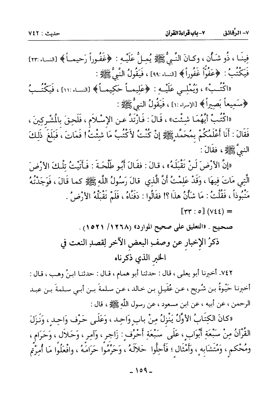 (كَانَ الْكِتَابُ الْأَوَّلُ يَنْزِلُ مِنْ بَابٍ وَاحِدٍ وَعَلَى حَرْفٍ وَاحِدٍ وَنَزَلَ الْقُرْآنُ مِنْ سَبْعَةِ أَبْوَابٍ عَلَى سَبْعَةِ أَحْرُفٍ: زَاجِرٌ وَآمِرٌ وَحَلَالٌ وَحَرَامٌ وَمُحْكَمٌ وَمُتَشَابِهٌ وَأَمْثَالٌ فأحلُّوا حَلَالَهُ وحرِّموا حَرَامَهُ وَافْعَلُوا مَا أُمرتم -[160]- بِهِ وَانْتَهُوا عَمَّا نُهِيتُم عَنْهُ وَاعْتَبِرُوا بِأَمْثَالِهِ وَاعْمَلُوا بِمُحْكَمِهِ وَآمِنُوا بِمُتَشَابِهِهِ وَقُولُوا: آمَنَّا بِهِ كُلٌّ مِنْ عِنْدِ رَبِّنَا)