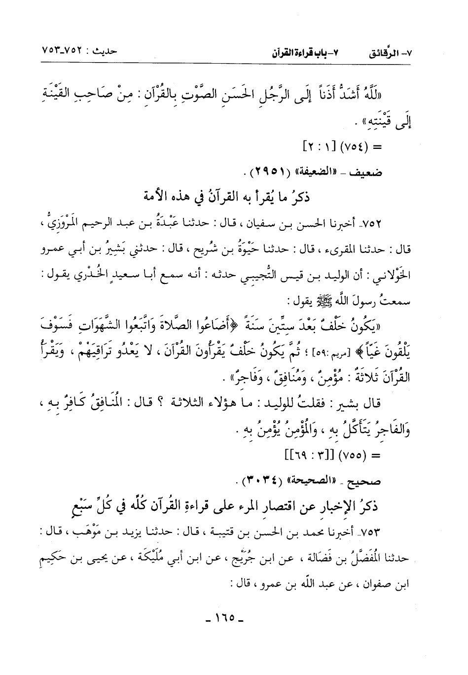 (يَكُونُ خَلْفٌ بَعْدَ سِتِّينَ سَنَةً {أَضَاعُوا الصَّلَاةَ واتَّبَعُوا الشَّهَوَاتِ فسوف يلقون غَيّاً} [مريم: 59] ثم يكون خَلْفٌ يقرأون الْقُرْآنَ لَا يَعْدُو تَرَاقِيَهُمْ وَيَقْرَأُ الْقُرْآنَ ثَلَاثَةٌ: مُؤْمِنٌ وَمُنَافِقٌ وَفَاجِرٌ)