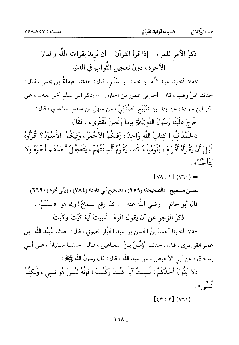 ذِكْرُ الْأَمْرِ لِلْمَرْءِ إِذَا قَرَأَ الْقُرْآنَ أَنْ يُرِيدَ بِقِرَاءَتِهِ اللَّهَ وَالدَّارَ الْآخِرَةَ دُونَ تَعْجِيلِ الثَّوَابِ فِي الدُّنْيَا