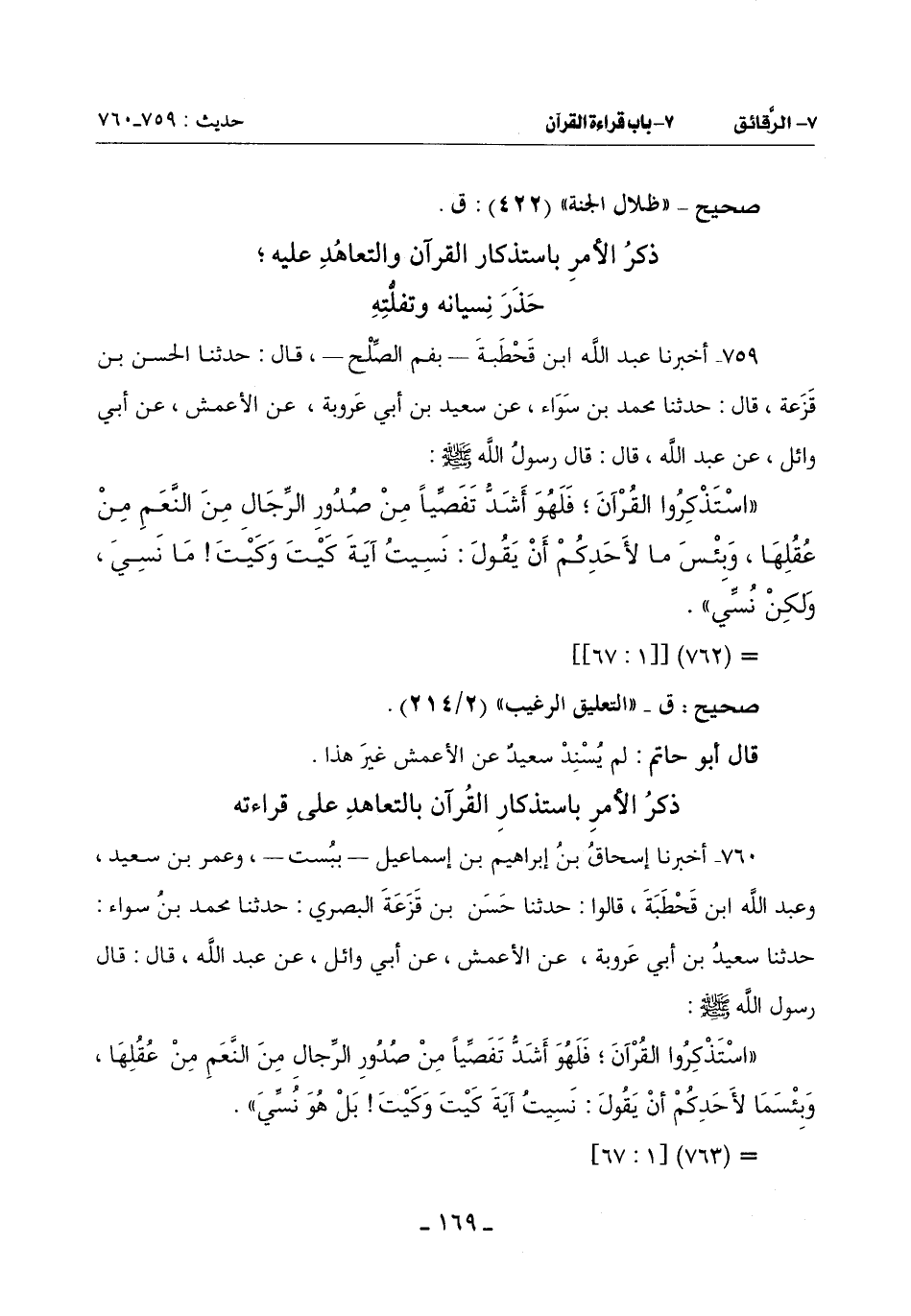 ذِكْرُ الْأَمْرِ بِاسْتِذْكَارِ الْقُرْآنِ بِالتَّعَاهُدِ عَلَى قِرَاءَتِهِ