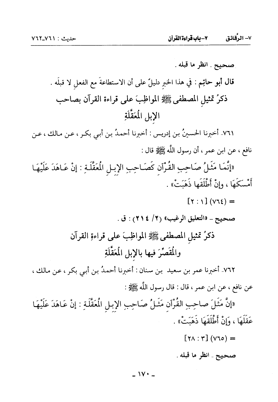 (إِنَّ مَثَلَ صَاحِبِ الْقُرْآنِ مَثَلُ صَاحِبِ الْإِبِلِ المُعَقَّلَة إِنْ عاهد عليها عَقَلَهَا وإن أطلقها ذهبت)