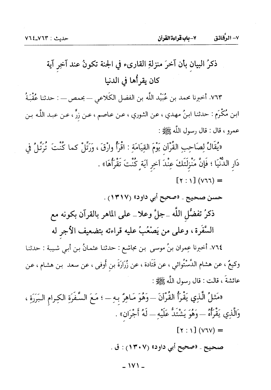 (يُقالُ لِصَاحِبِ الْقُرْآنِ يَوْمَ الْقِيَامَةِ: اقْرَأْ وَارْقَ وَرَتِّل كَمَا كُنْتَ تُرَتِّل فِي دَارِ الدُّنْيَا فإن منزلتك عند آخر آية كنت تقرأها)