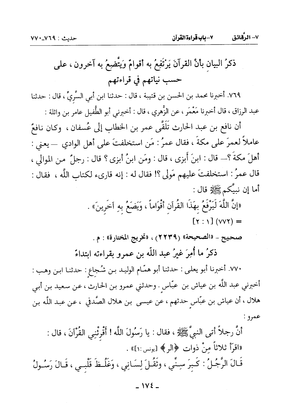 ذِكْرُ الْبَيَانِ بِأَنَّ الْقُرْآنَ يَرْتَفِعُ بِهِ أَقْوَامٌ ويتَّضِعُ بِهِ آخَرُونَ عَلَى حَسَبِ نِيَّاتِهِمْ فِي قراءتهم