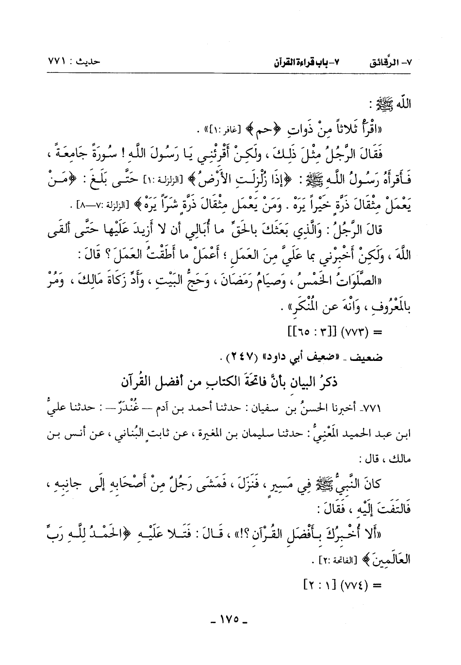 قَالَ أَبُو حَاتِمٍ: قَوْلُهُ صَلَّى اللَّهُ عَلَيْهِ وَسَلَّمَ: (أَلَا أُخْبِرُكَ بِأَفْضَلِ الْقُرْآنِ) أَرَادَ بِهِ: بِأَفْضَلِ الْقُرْآنِ لَكَ لَا أَنَّ بَعْضَ الْقُرْآنِ يَكُونُ أَفْضَلَ مِنْ بَعْضٍ لِأَنَّ كَلَامَ اللَّهِ يَسْتَحِيلُ أَنْ يَكُونَ فِيهِ تَفَاوُتُ التَّفَاضُلِ