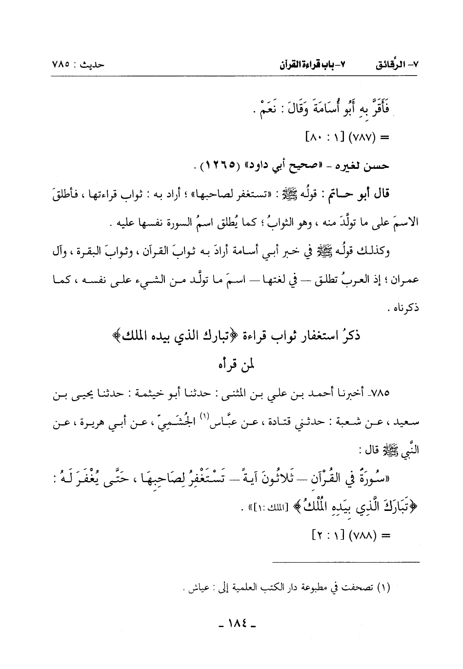 785 - أَخْبَرَنَا أَحْمَدُ بْنُ عَلِيِّ بْنِ الْمُثَنَّى حَدَّثَنَا أَبُو خَيْثَمَةَ حَدَّثَنَا يَحْيَى بْنُ سَعِيدٍ عَنْ شُعْبَةَ حَدَّثَنِي قَتَادَةُ عَنْ عَبَّاسٍ (¬1) الجُشمي عَنْ أَبِي هُرَيْرَةَ عَنِ النَّبِيِّ صَلَّى اللَّهُ عَلَيْهِ وَسَلَّمَ قَالَ: