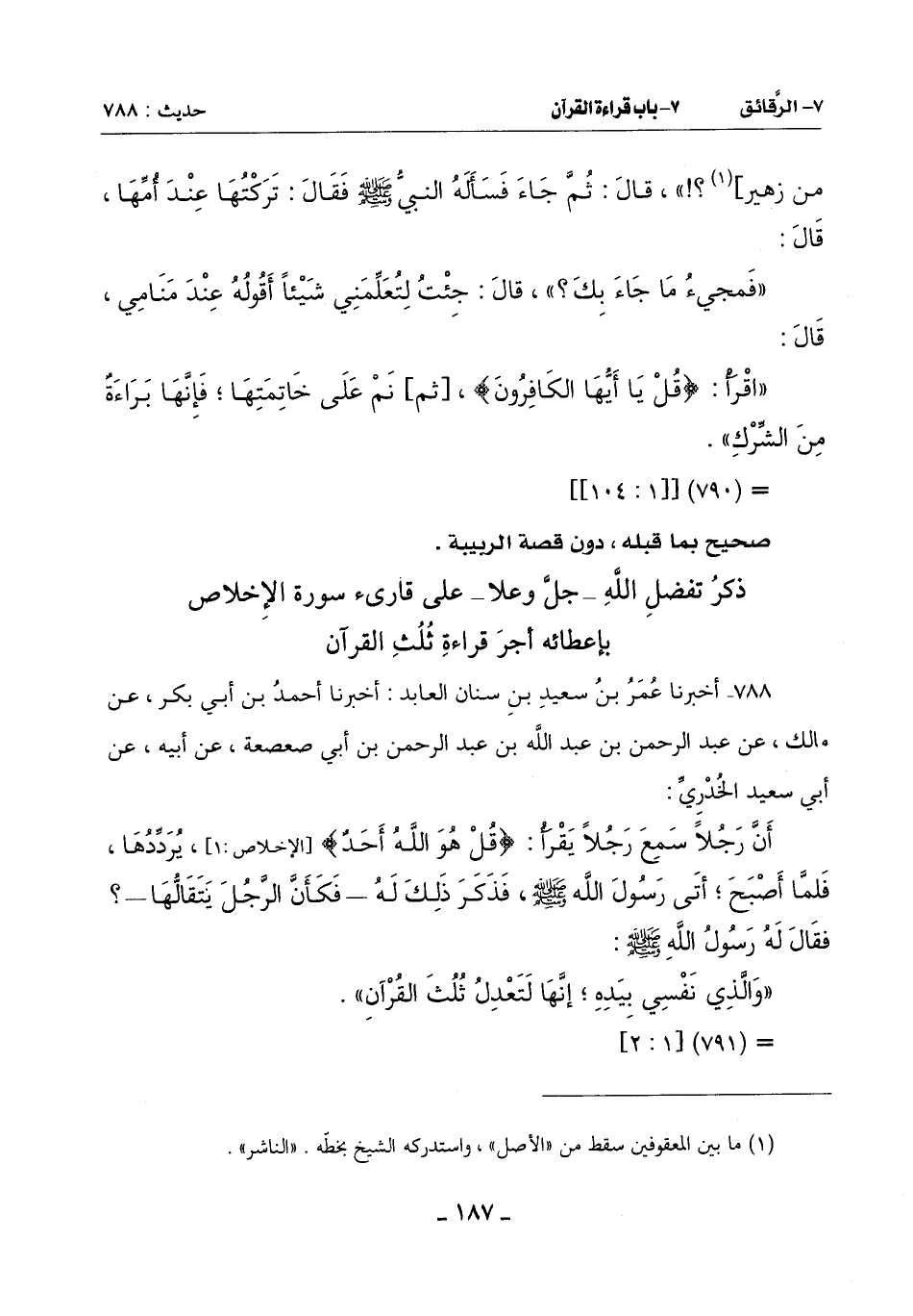 788 - أَخْبَرَنَا عُمَرُ بْنُ سَعِيدِ بْنِ سِنَانٍ الْعَابِدُ أَخْبَرَنَا أَحْمَدُ بْنُ أَبِي بَكْرٍ عَنْ مَالِكٍ عَنْ عَبْدِ الرَّحْمَنِ بْنِ عَبْدِ اللَّهِ بْنِ عَبْدِ الرَّحْمَنِ بْنِ أَبِي صَعْصَعَةَ عَنْ أَبِيهِ عَنْ أَبِي سَعِيدٍ الْخُدْرِيِّ: