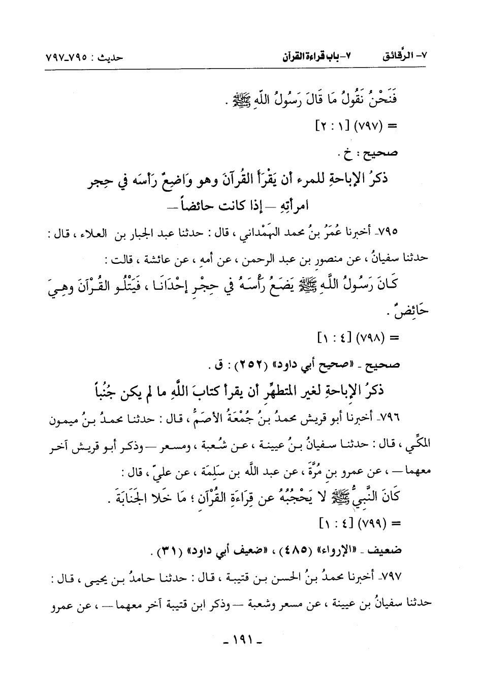 كَانَ رَسُولُ اللَّهِ صَلَّى اللَّهُ عَلَيْهِ وَسَلَّمَ يَضَعُ رَأْسَهُ فِي حِجْرِ إحدانا فيتلو القرآن وهي حائض