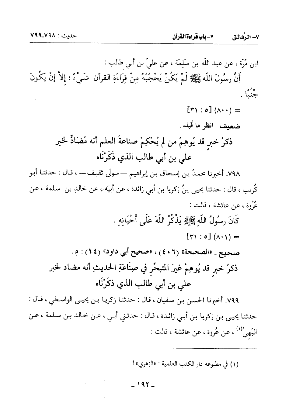 799 - أَخْبَرَنَا الْحَسَنُ بْنُ سُفْيَانَ قَالَ: حَدَّثَنَا زَكَرِيَّا بْنُ يَحْيَى الْوَاسِطِيُّ قَالَ: حَدَّثَنَا يَحْيَى بْنُ زَكَرِيَّا بْنِ أَبِي زَائِدَةَ قَالَ: حَدَّثَنِي أَبِي عَنْ خَالِدِ بْنِ سَلَمَةَ عَنِ البهيِّ (¬1) عَنْ عُرْوَةَ عَنْ عَائِشَةَ قَالَتْ: