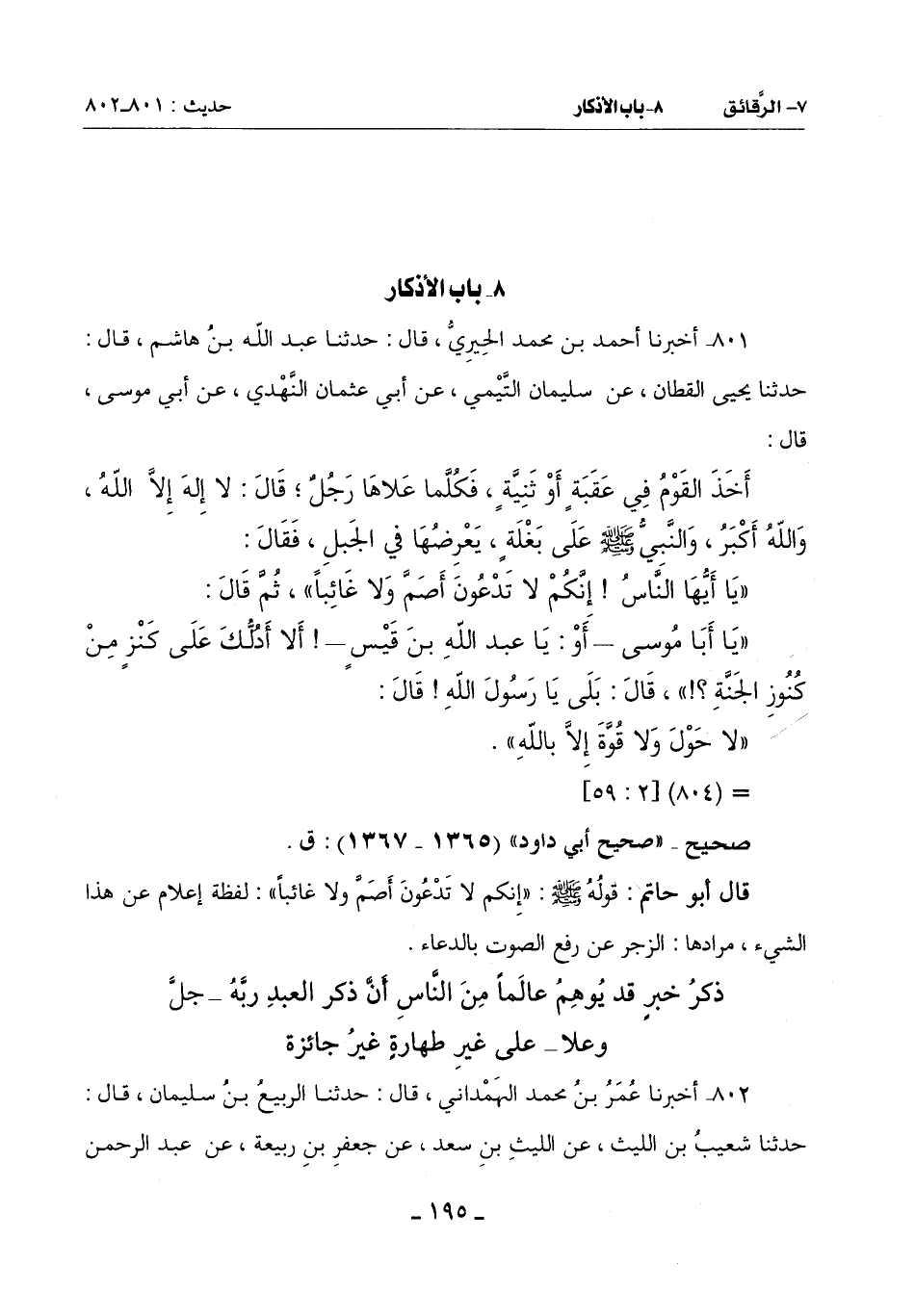 (يَا أَيُّهَا النَّاسُ إِنَّكُمْ لَا تَدْعُونَ أَصَمَّ وَلَا غَائِبًا) ثُمَّ قَالَ: