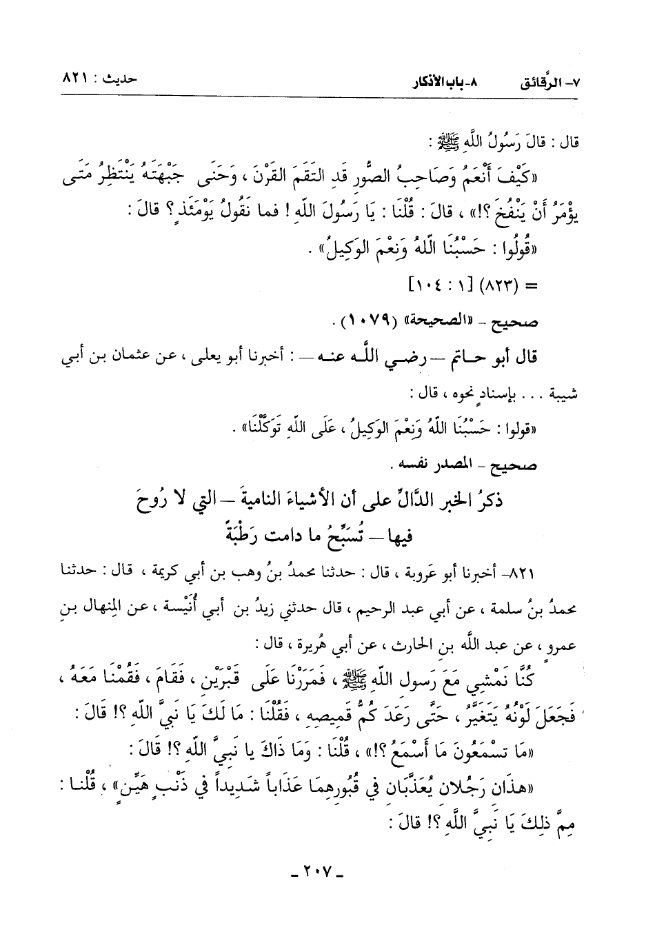 (هَذَانِ رَجُلَانِ يُعَذَّبَانِ فِي قُبُورِهِمَا عَذَابًا شَدِيدًا فِي ذَنْبٍ هَيِّنٍ) قُلْنَا: مِمَّ ذَلِكَ يَا نَبِيَّ اللَّهِ؟ قَالَ: -[208]-