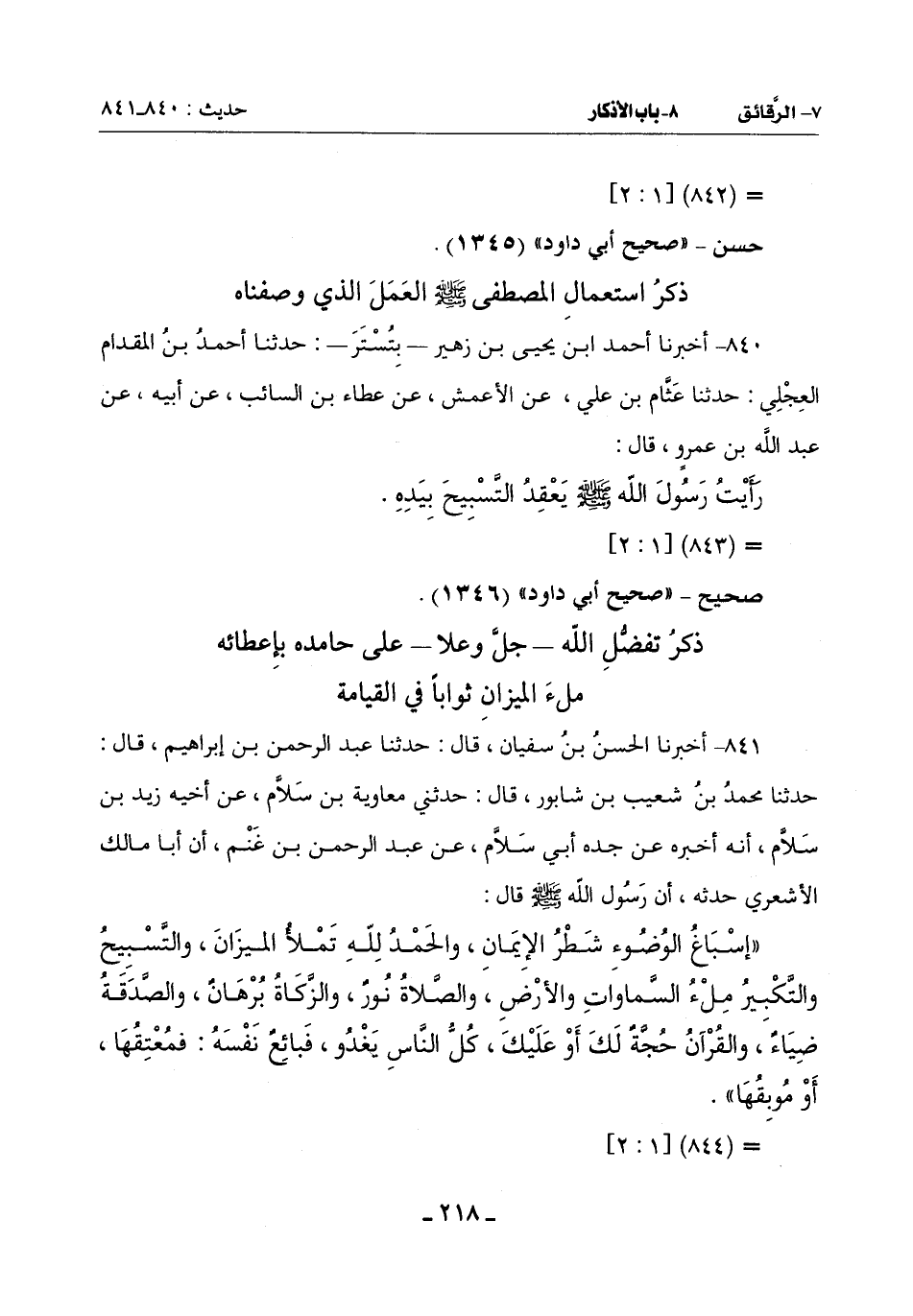 840 - أَخْبَرَنَا أَحْمَدُ بْنُ يَحْيَى بْنِ زُهَيْرٍ بِتُسْتَرَ حَدَّثَنَا أَحْمَدُ بْنُ الْمِقْدَامِ الْعِجْلِيُّ حَدَّثَنَا عثَّام بْنُ عَلِيٍّ عَنِ الْأَعْمَشِ عَنْ عَطَاءِ بْنِ السَّائِبِ عَنْ أَبِيهِ عَنْ عَبْدِ اللَّهِ بْنِ عَمْرٍو قَالَ:
