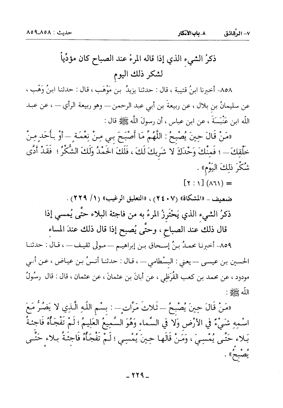 (مَنْ قَالَ حِينَ يُصْبِحُ ثَلَاثَ مَرَّاتٍ: بِسْمِ اللَّهِ الَّذِي لَا يَضُرُّ مَعَ اسْمِهِ شَيْءٌ فِي الْأَرْضِ وَلَا فِي السَّمَاءِ وَهُوَ السَّمِيعُ الْعَلِيمُ لَمْ تَفْجَأْهُ فَاجِئَةُ بَلَاءٍ حَتَّى يُمْسِيَ وَمَنْ قَالَهَا حِينَ يُمْسِي لَمْ تَفْجَأْهُ فَاجِئَةُ بَلَاءٍ حَتَّى يُصْبِحَ) -[230]-