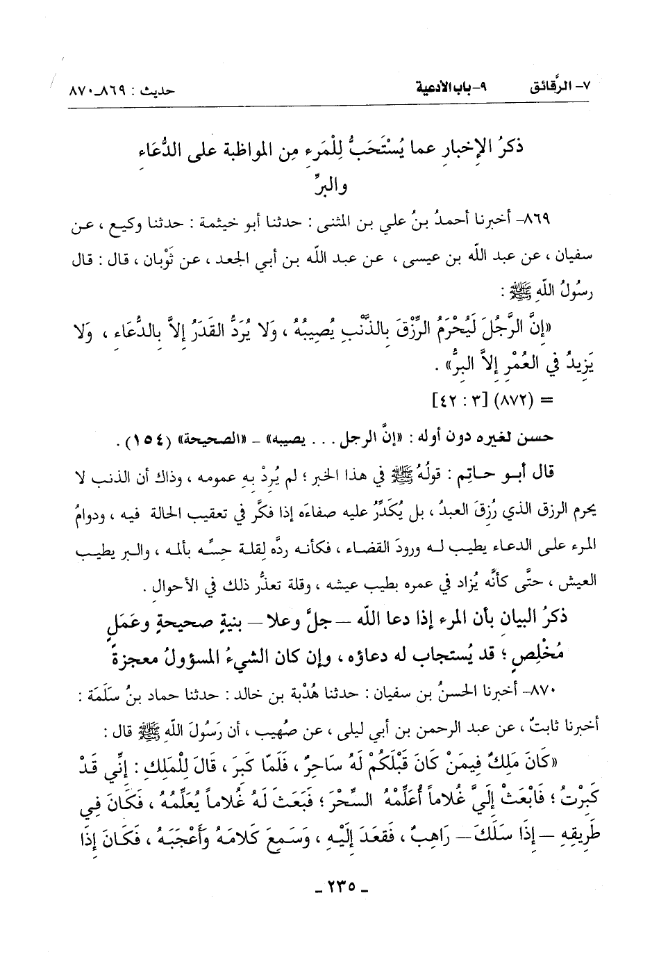 ذِكْرُ الْإِخْبَارِ عَمَّا يُسْتَحَبُّ لِلْمَرْءِ مِنَ الْمُوَاظَبَةِ على الدعاء والبر