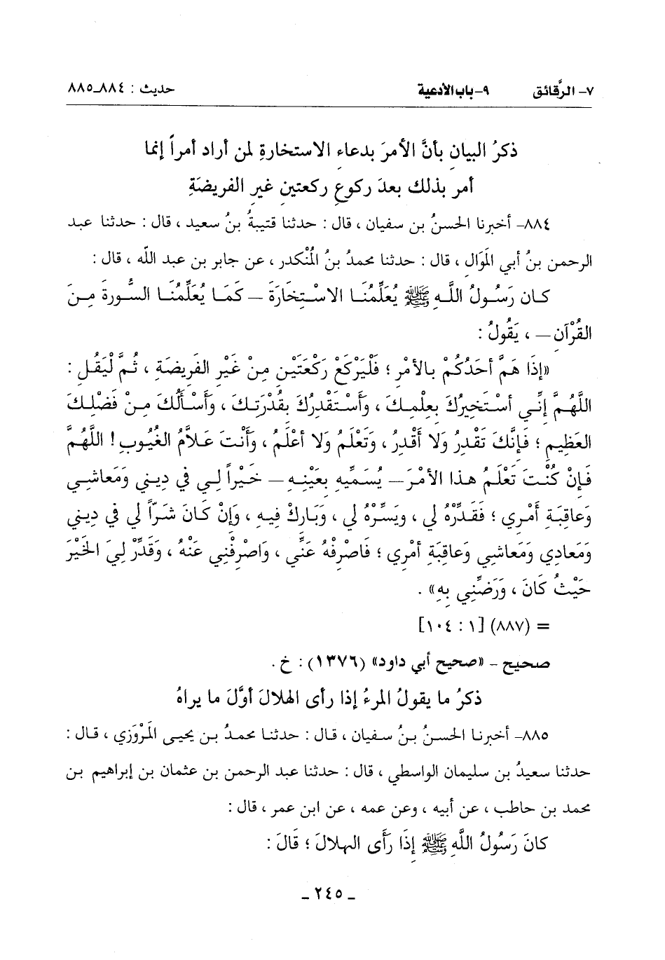 (إِذَا هَمَّ أَحَدُكُمْ بِالْأَمْرِ فَلْيَرْكَعْ رَكْعَتَيْنِ مِنْ غَيْرِ الْفَرِيضَةِ ثُمَّ لِيَقُلِ: اللَّهُمَّ إِنِّي أَسْتَخِيرُكَ بِعِلْمِكَ وَأَسْتَقْدِرُكَ بِقُدْرَتِكَ وَأَسْأَلُكَ مِنْ فَضْلِكَ الْعَظِيمِ فَإِنَّكَ تَقْدِرُ وَلَا أَقْدِرُ وَتَعْلَمُ وَلَا أَعْلَمُ وَأَنْتَ عَلَّامُ الْغُيُوبِ اللَّهُمَّ فَإِنْ كُنْتَ تَعْلَمُ هَذَا الْأَمْرَ - يُسَمِّيهِ بعَيْنِهِ - خَيْرًا لِي فِي دِينِي وَمَعَاشِي وَعَاقِبَةِ أَمْرِي فَقَدِّرْهُ لِي وَيَسِّرْهُ لِي وَبَارِكْ فِيهِ وَإِنْ كَانَ شَرًّا لِي فِي دِينِي وَمَعَادِي وَمَعَاشِي وَعَاقِبَةِ أَمْرِي فَاصْرِفْهُ عَنِّي وَاصْرِفْنِي عَنْهُ وقَدِّرْ لِيَ الْخَيْرَ حَيْثُ كان ورضني به)