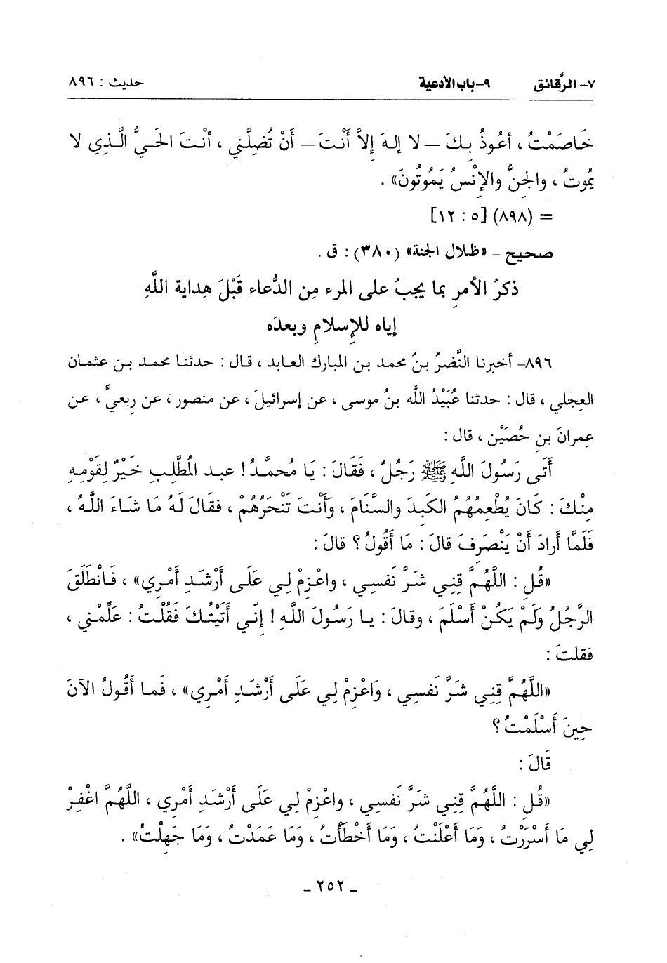 896 - أَخْبَرَنَا النَّضْرُ بْنُ مُحَمَّدِ بْنِ الْمُبَارَكِ الْعَابِدُ قَالَ: حَدَّثَنَا مُحَمَّدُ بْنُ عُثْمَانَ الْعِجْلِيُّ قَالَ: حَدَّثَنَا عُبَيْدُ اللَّهِ بْنُ مُوسَى عَنْ إِسْرَائِيلَ عَنْ مَنْصُورٍ عَنْ رِبْعِيٍّ عَنْ عِمْرَانَ بْنِ حُصَيْنٍ قَالَ: