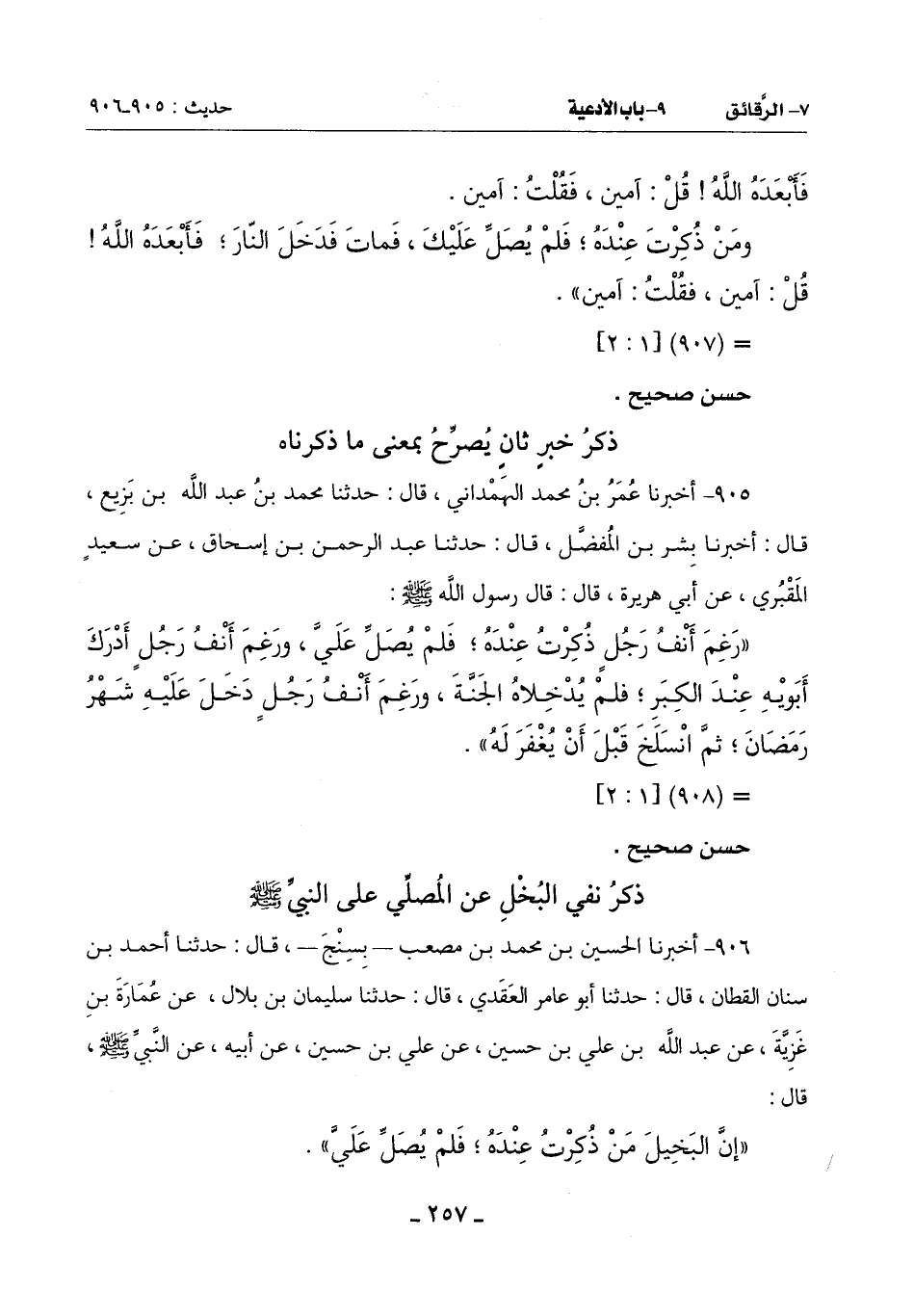(رَغِمَ أَنْفُ رَجُلٍ ذُكِرْتُ عِنْدَهُ فَلَمْ يُصَلِّ عَلَيَّ ورَغِمَ أَنْفُ رَجُلٍ أَدْرَكَ أَبَوَيْهِ عِنْدَ الْكِبَرِ فَلَمْ يُدْخِلَاهُ الْجَنَّةَ ورَغِمَ أَنْفُ رَجُلٍ دَخَلَ عَلَيْهِ شَهْرُ رَمَضَانَ ثُمَّ انْسَلَخَ قَبْلَ أَنْ يُغفر لَهُ)